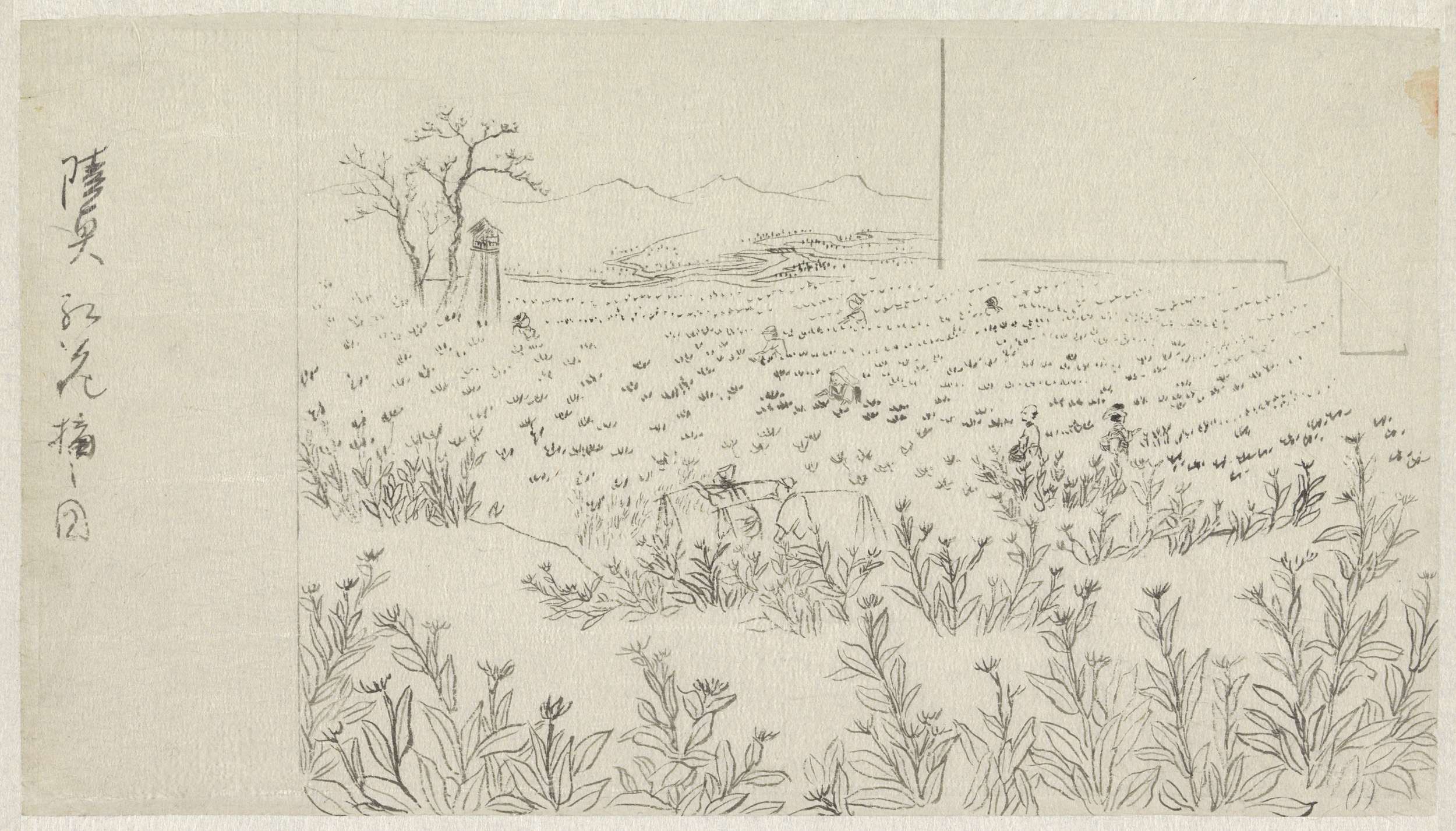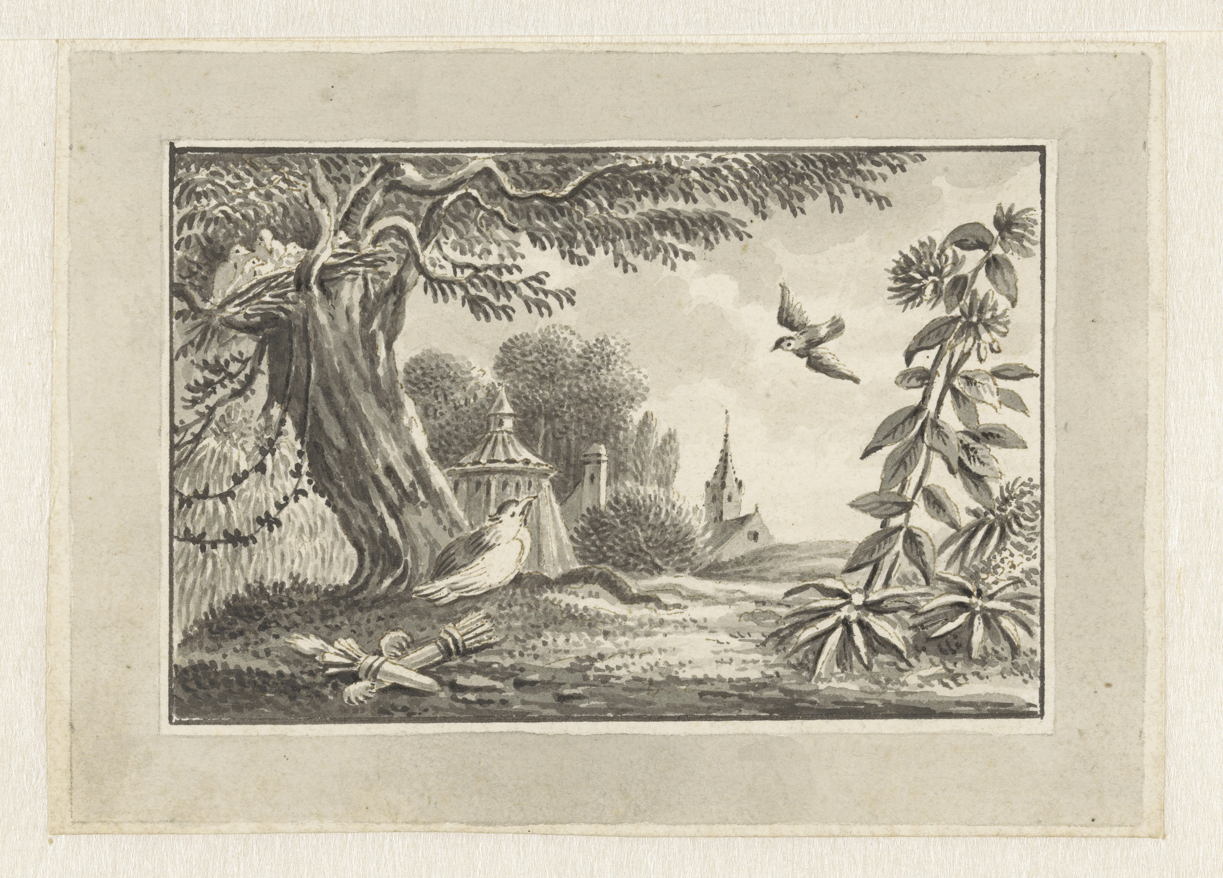 Schetsblad met reebok in struikgewas en twee haviksk...
