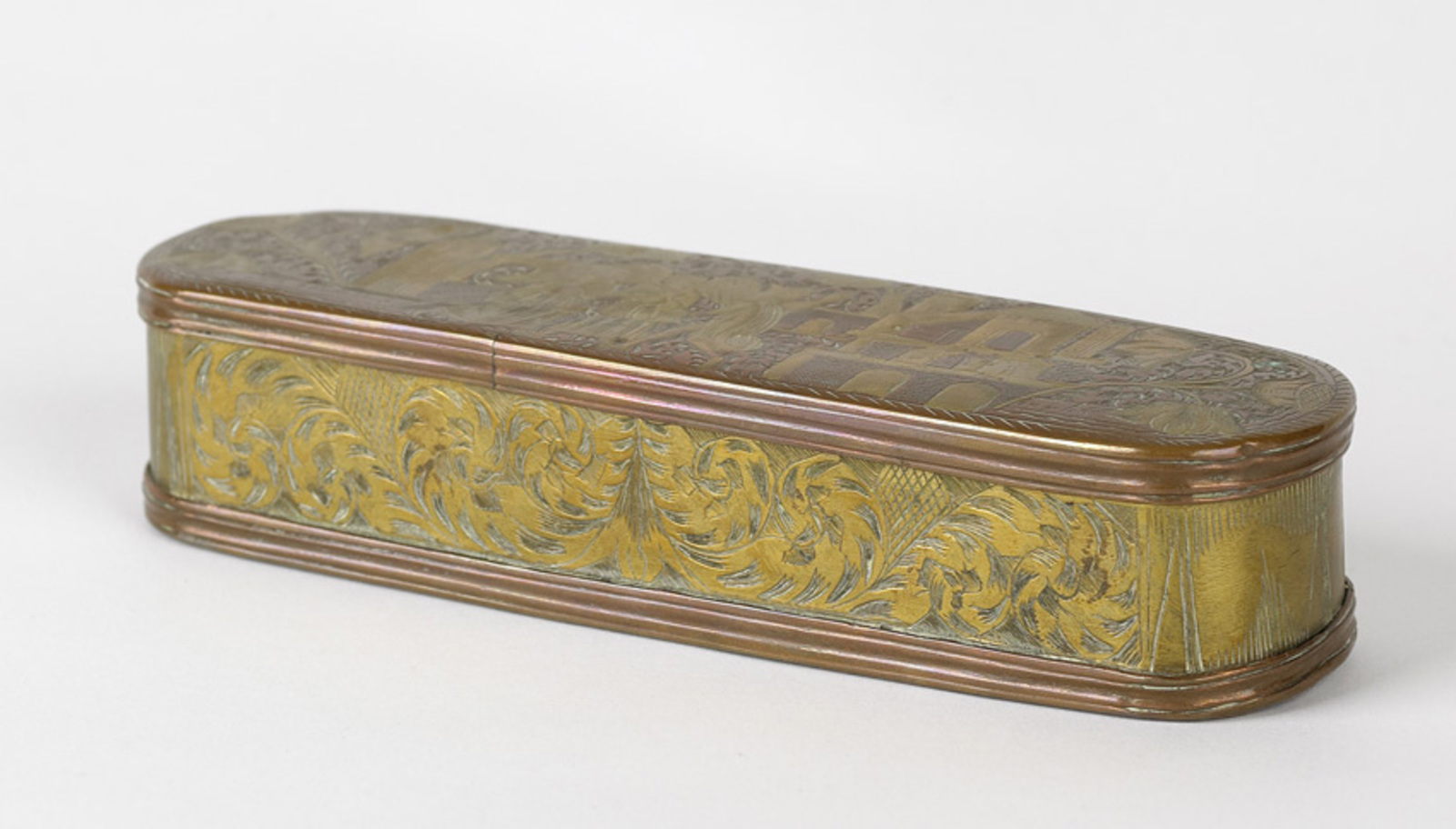 Tabaksdoos van koper en messing met een voorstelling...