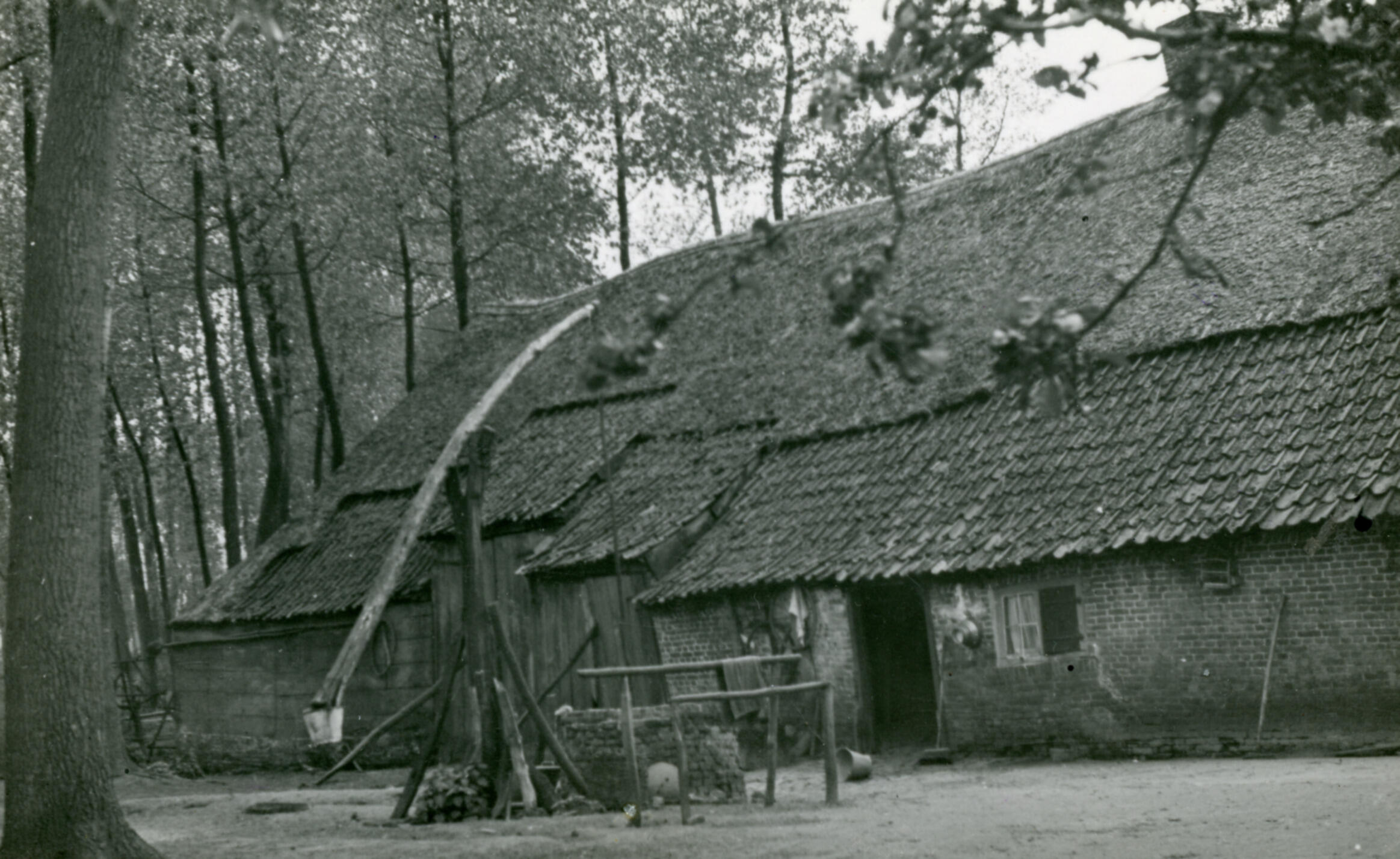 Schuur en boerderij, Vernhout, 1935 (zwart-wit foto)