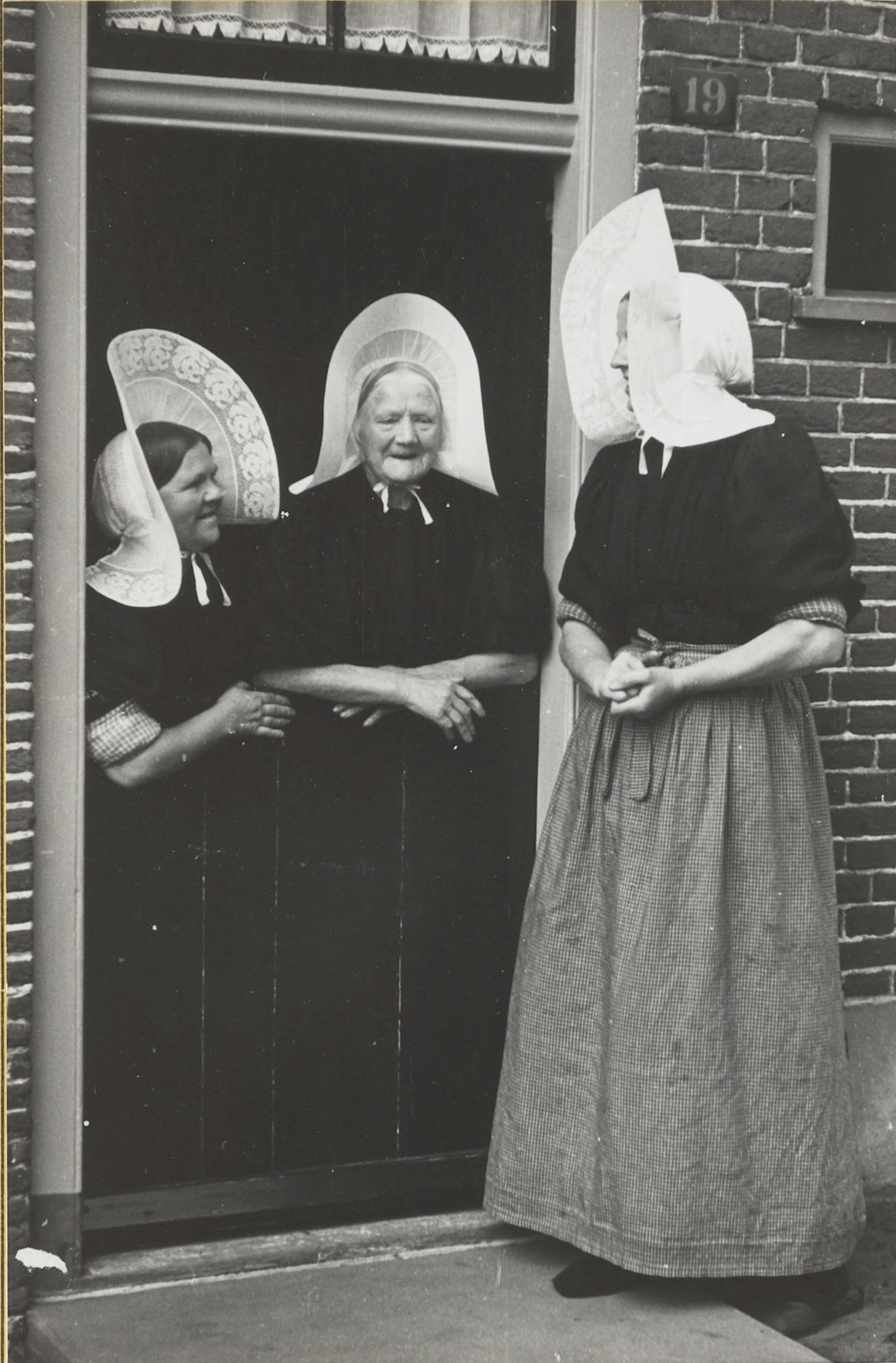 Drie vrouwen in streekdracht, Huizen, 1945 (zwart-wi...
