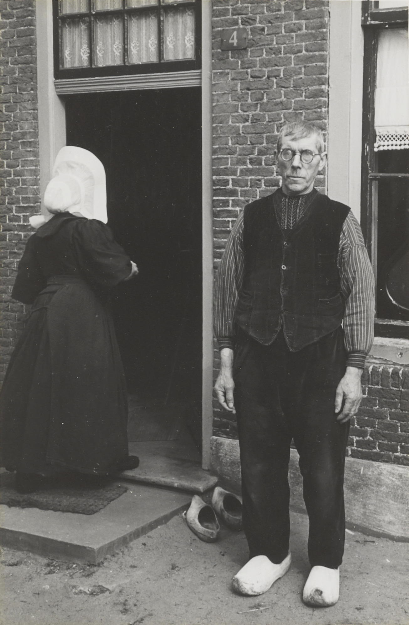 Vrouw en man in streekdracht, Huizen, 1945 (zwart-wi...