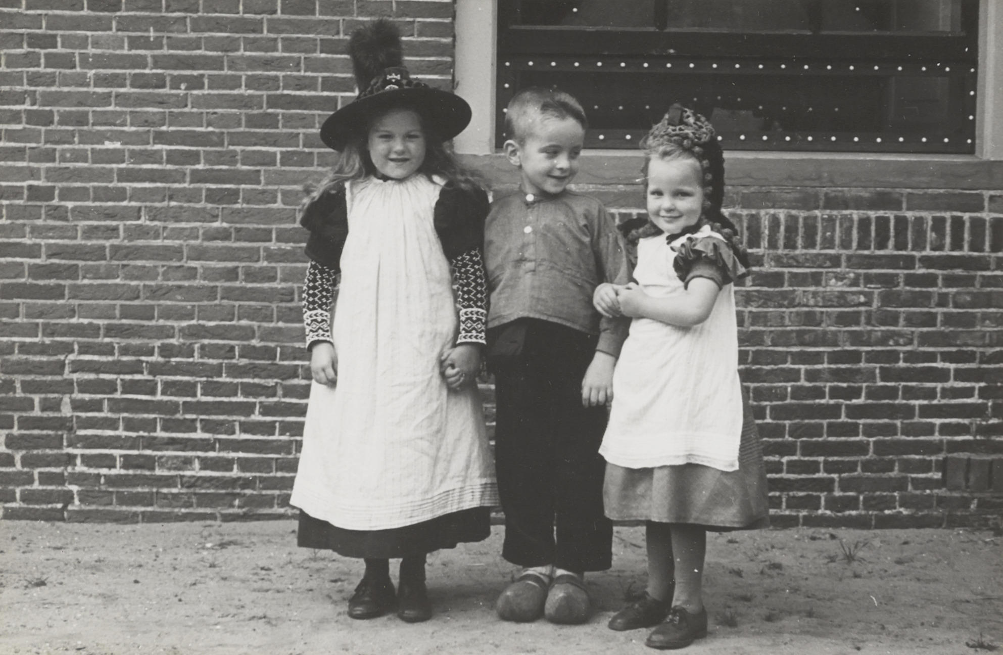 Kinderen verkleed in streekdracht, Huizen, 1945 (zwa...