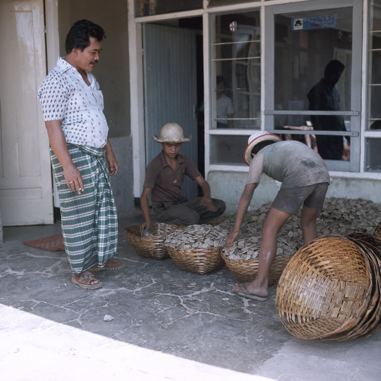 De zongedroogde kroepoek wordt verzameld. Kroepoekfa...