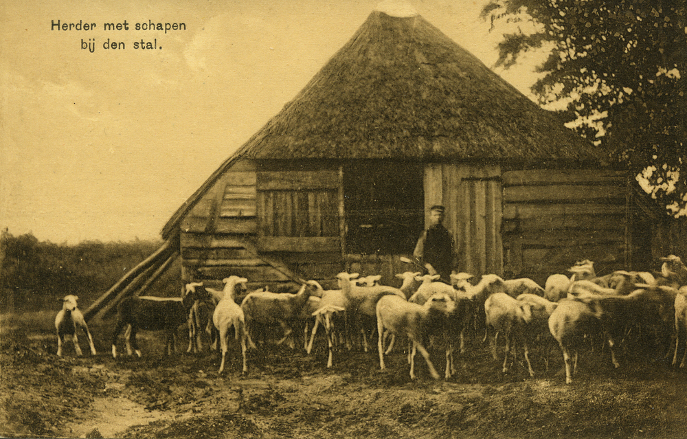 Herder met schapen bij den stal