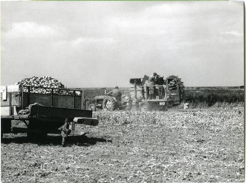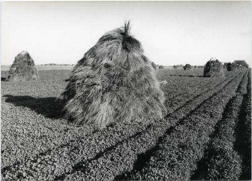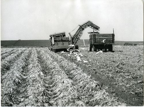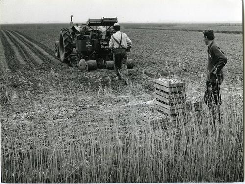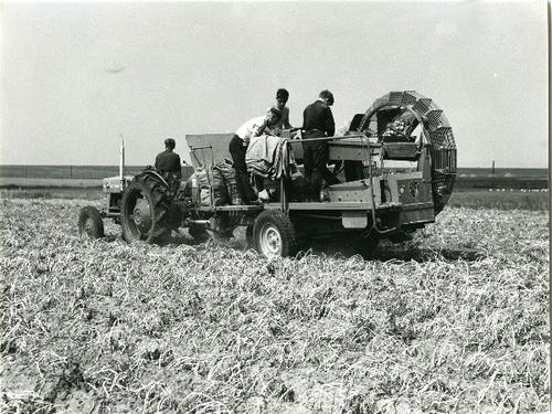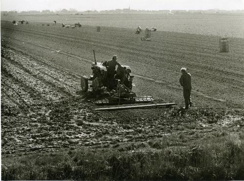 Foto in zwart-wit van het machinaal rooien van aarda...