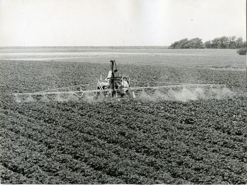 Foto in zwart-wit van het spuiten van een aardappelv...