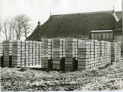 Foto in zwart-wit van kiembakken op een erf door J.D...