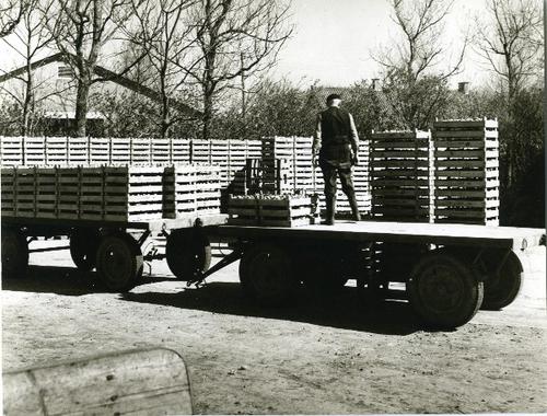 Foto in zwart-wit van een paar aanhangwagens geladen...