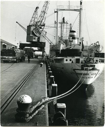 Foto in zwart-wit van het laden zakken aardappelen i...