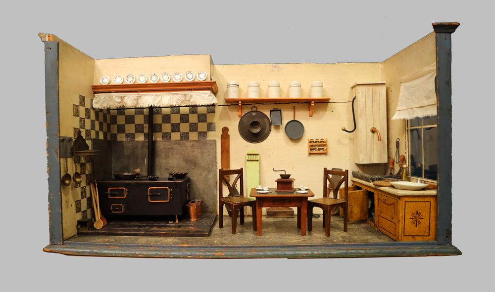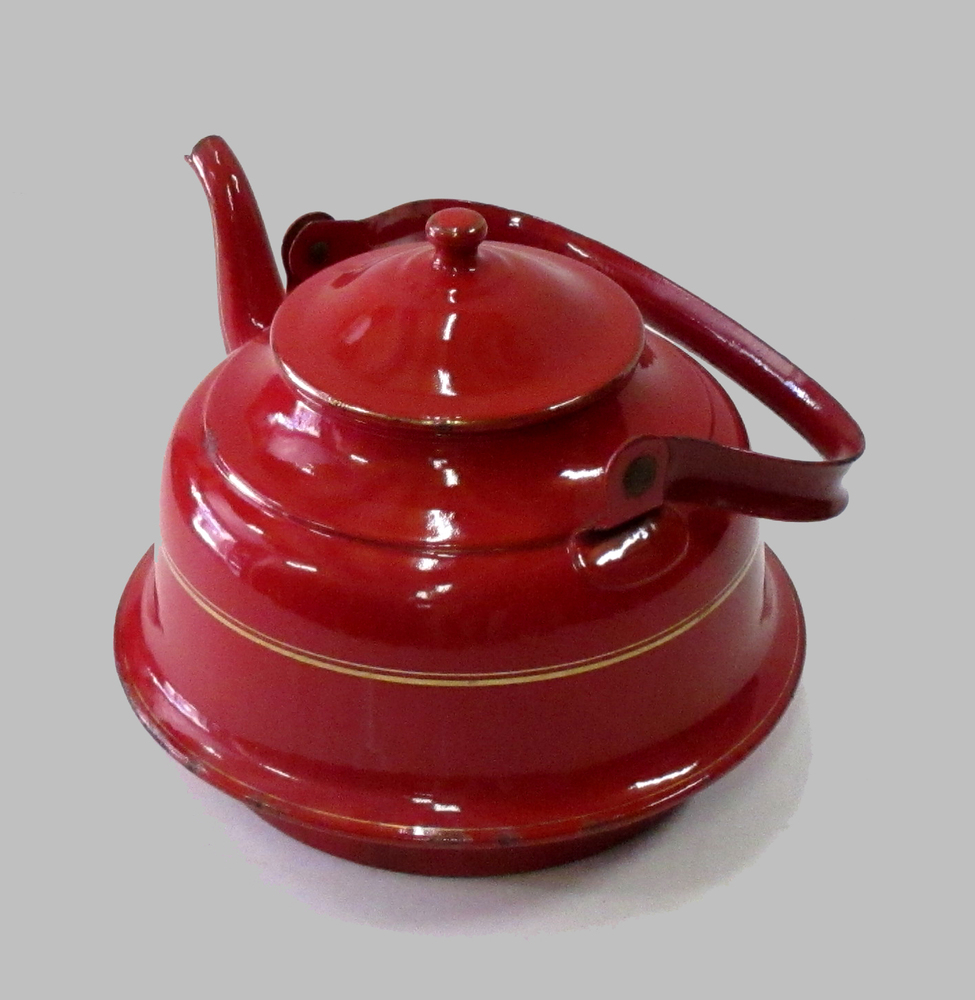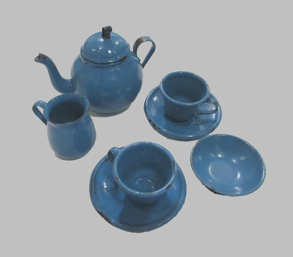 Speelgoedpannenset uit 1940 van grijs gewolkt email