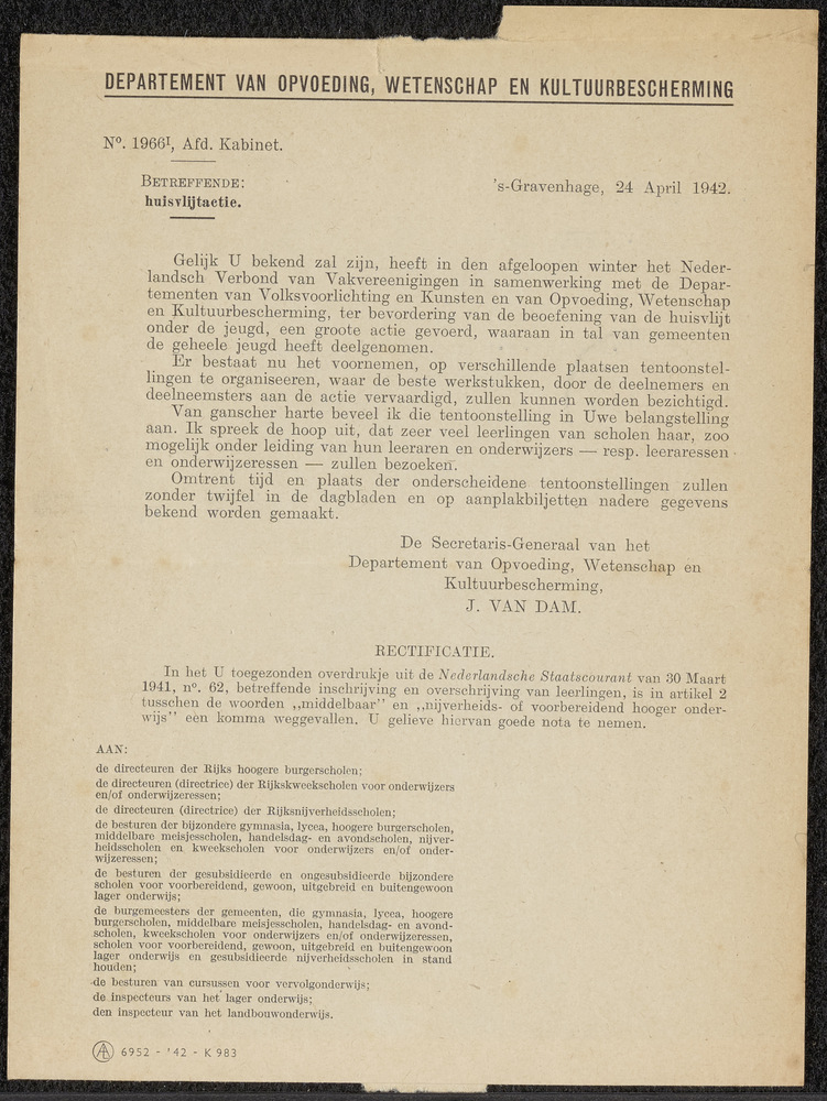 Brief van het Departement van Opvoeding, Wetenschap ...