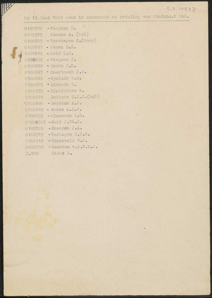 Namenlijst met kop "Op 13 juni 1945 over in onderhou...