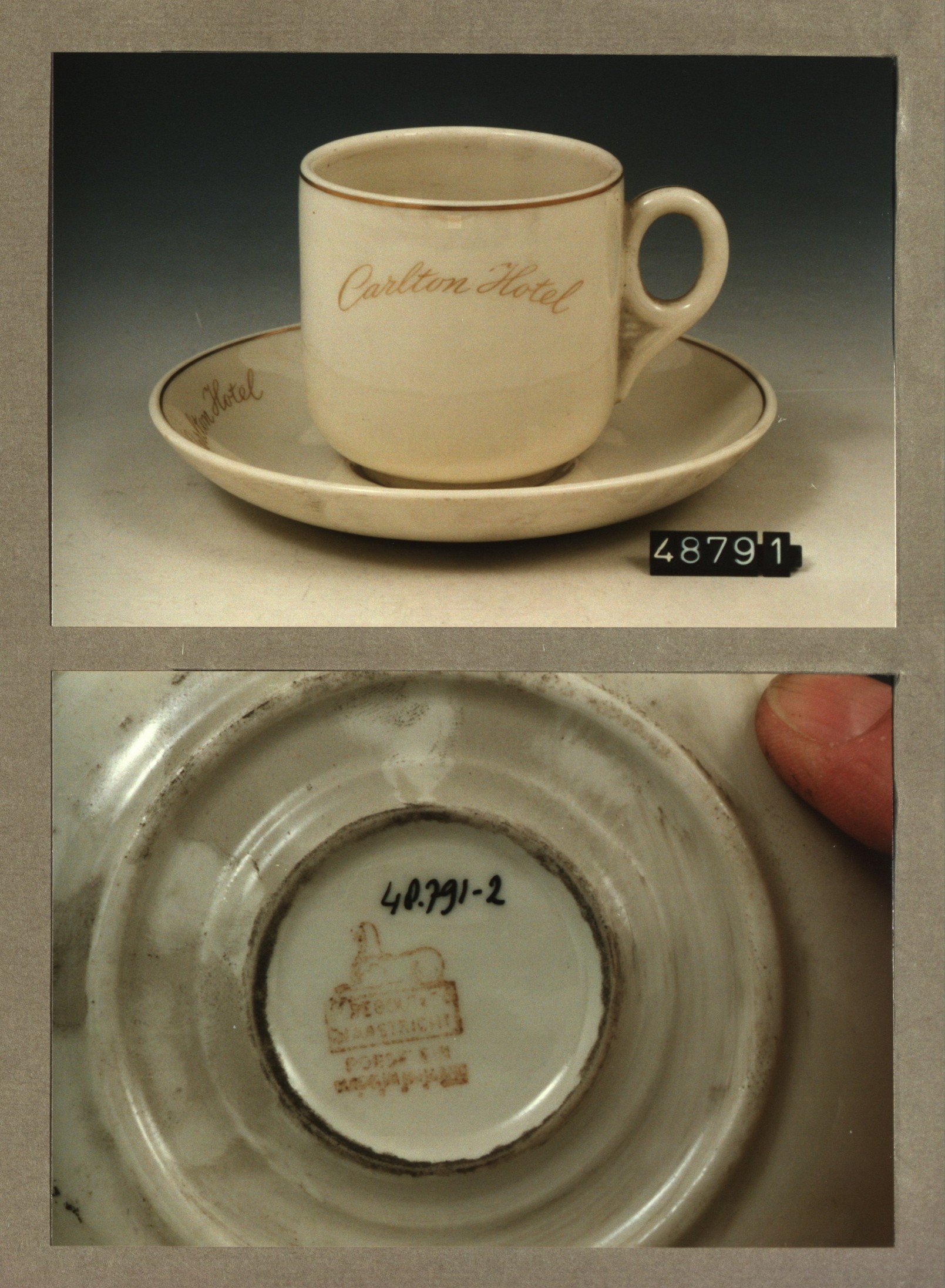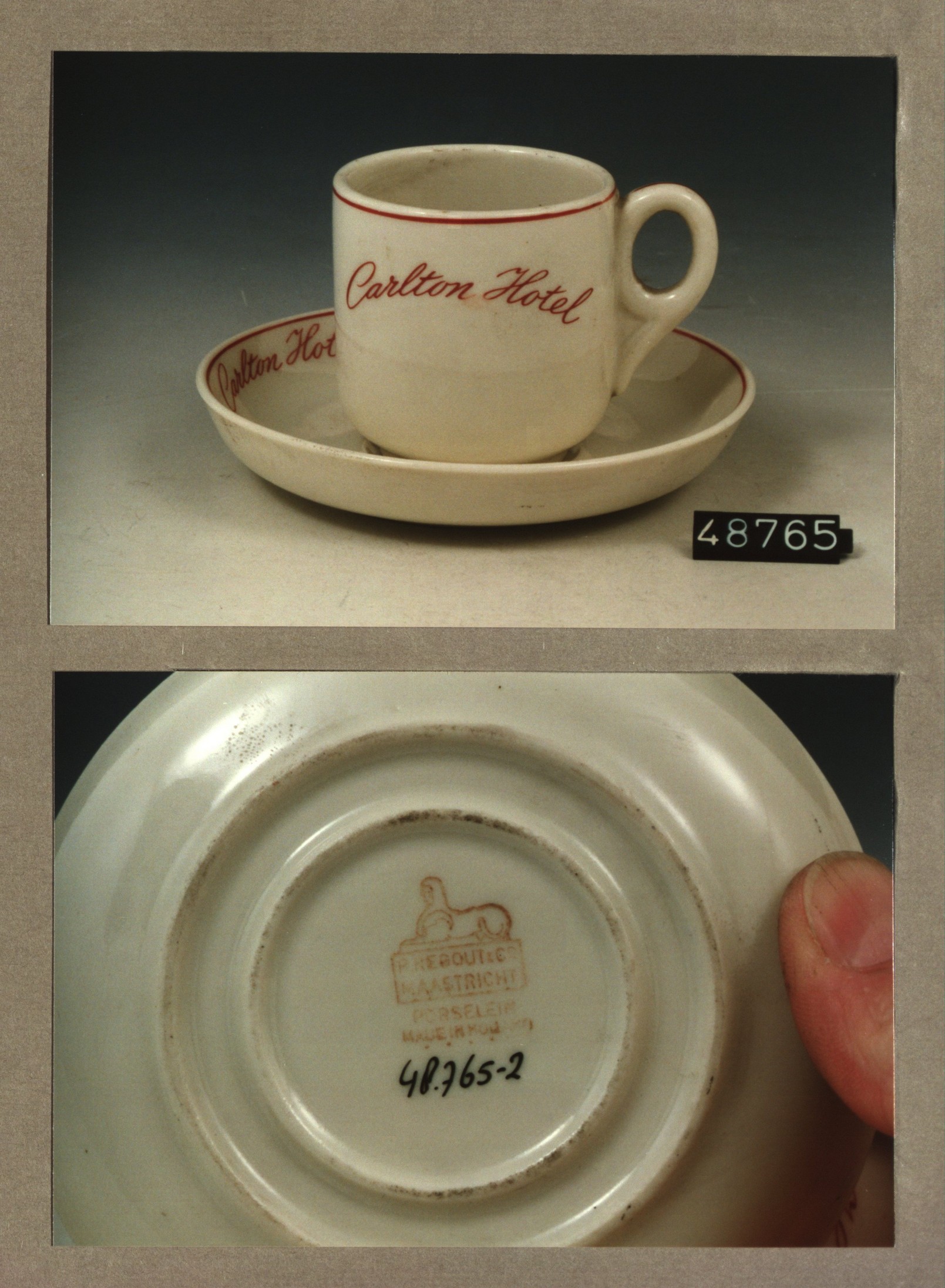 Kop en schotel, model F met decor Carlton hotel
