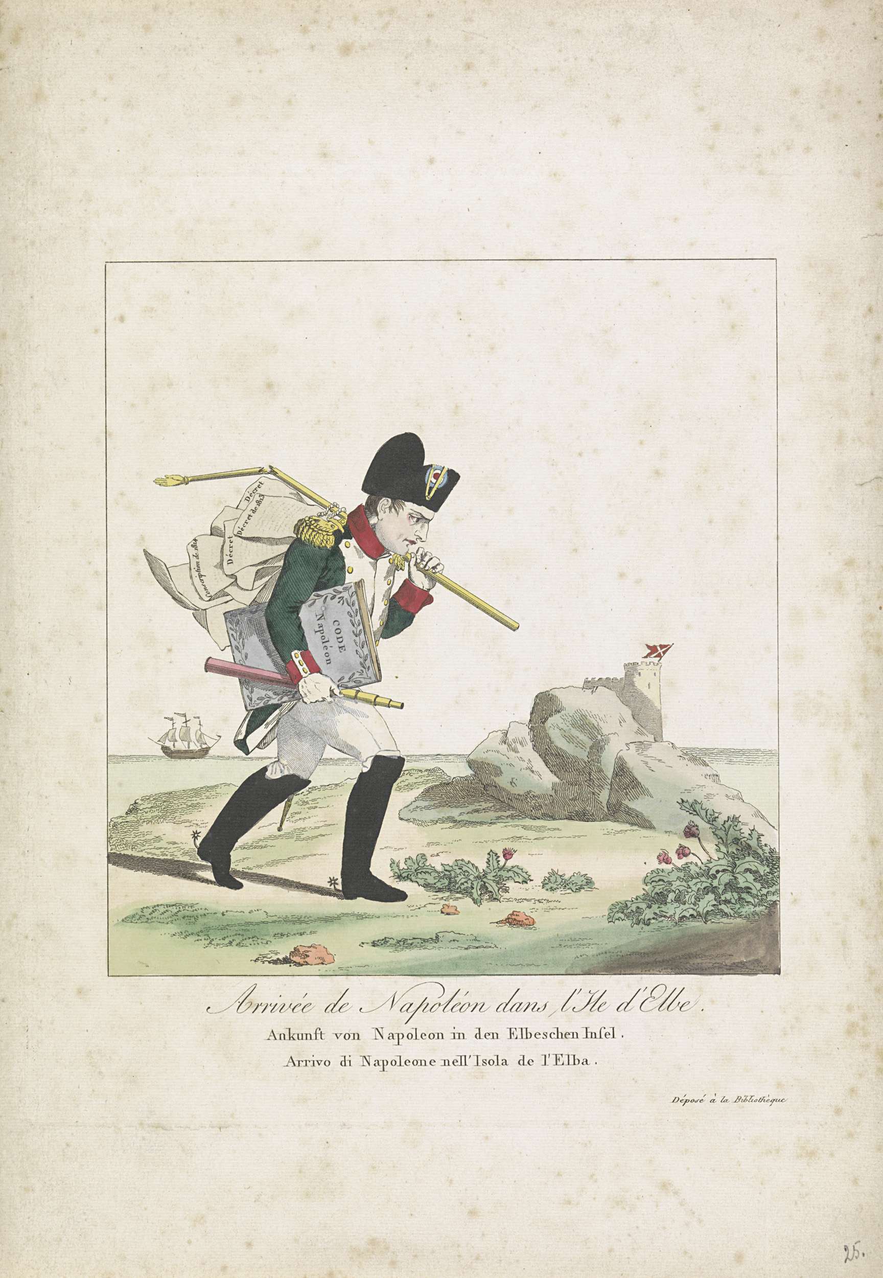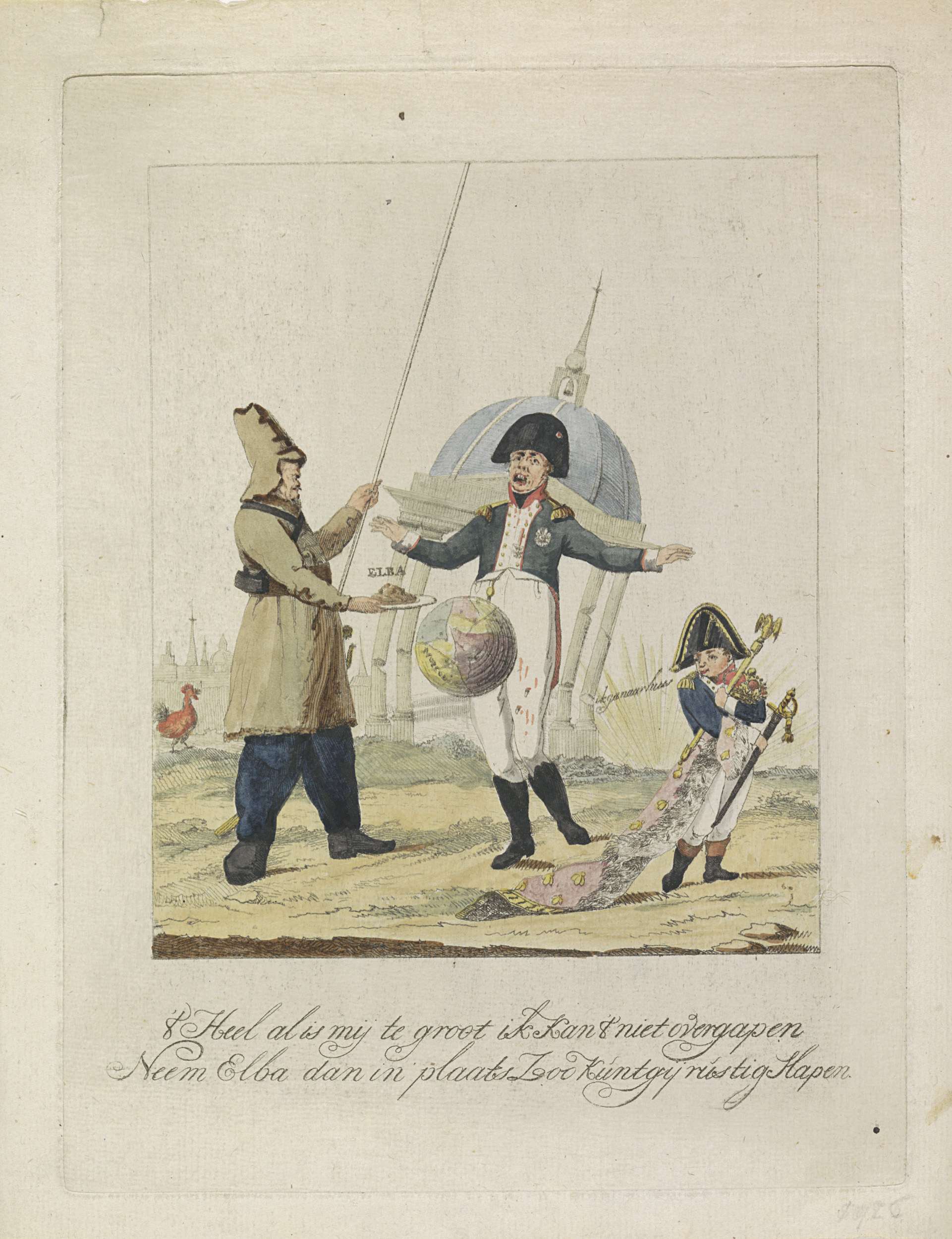 Spotprent op Napoleons verbanning naar Elba, 1814