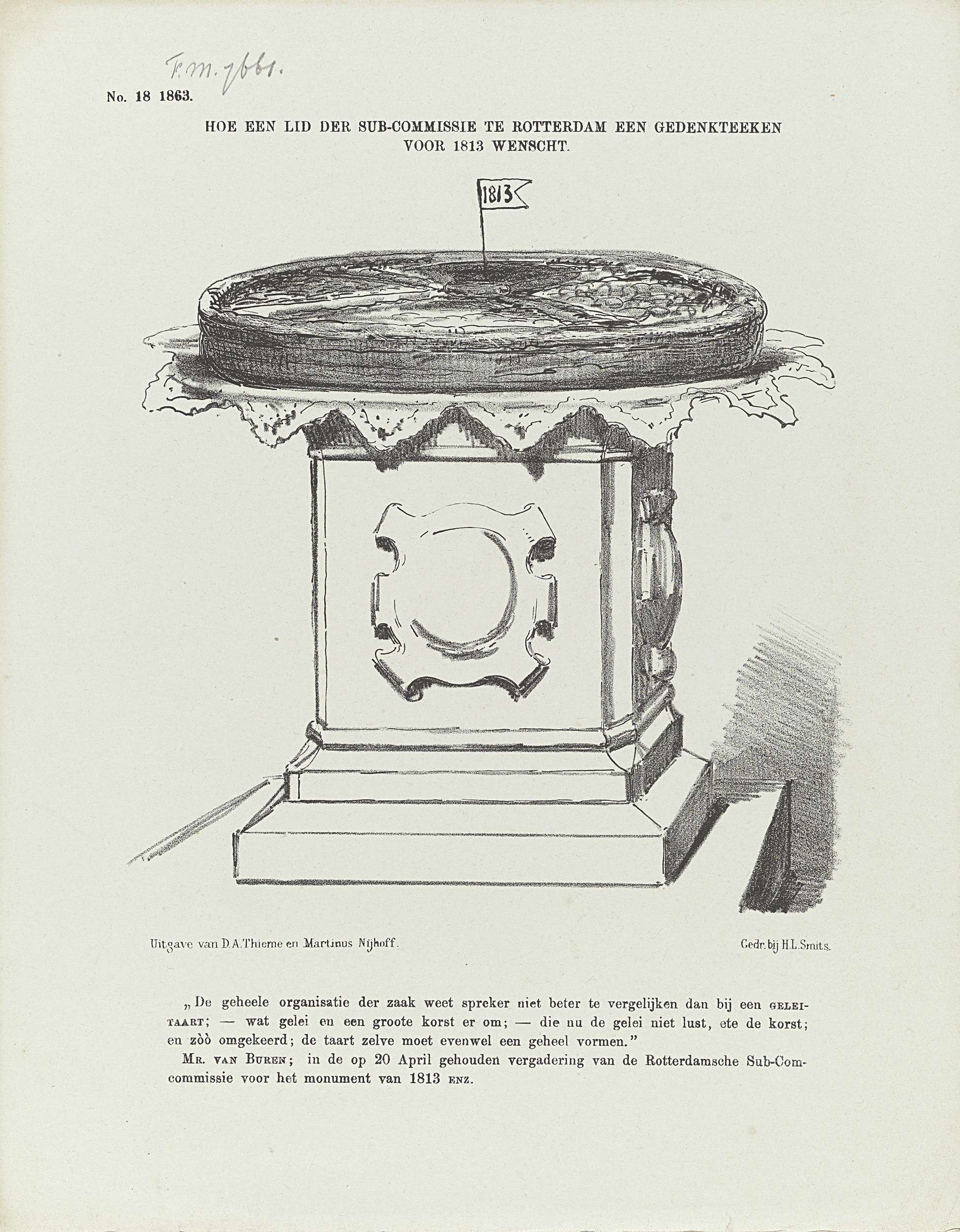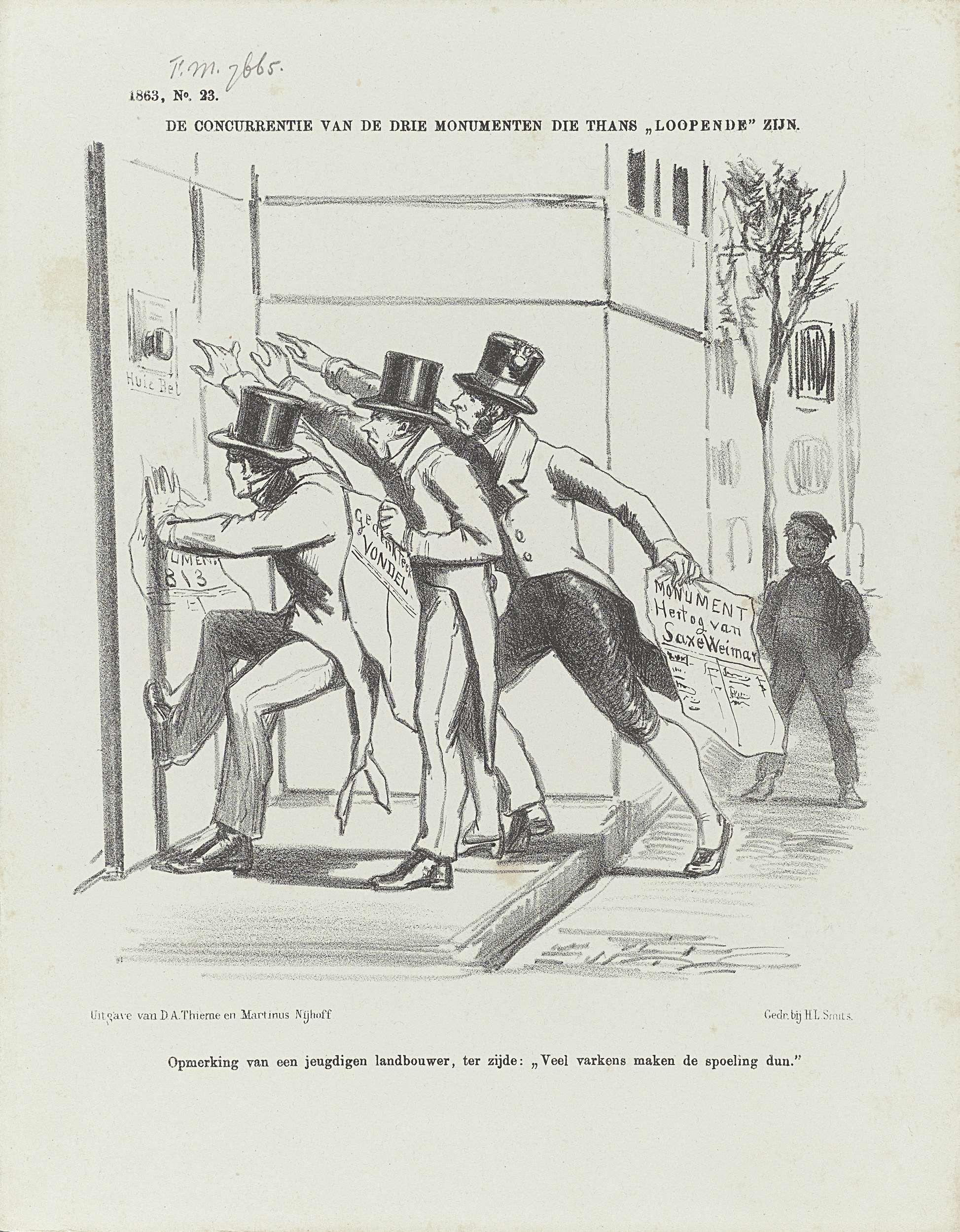 Spotprent op de drie geplande monumenten, 1863
