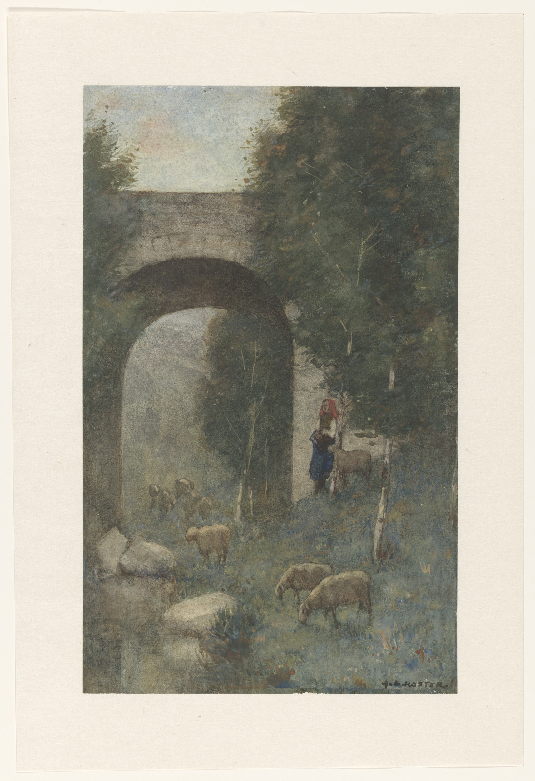 Herderin met schapen, bij een viaduct