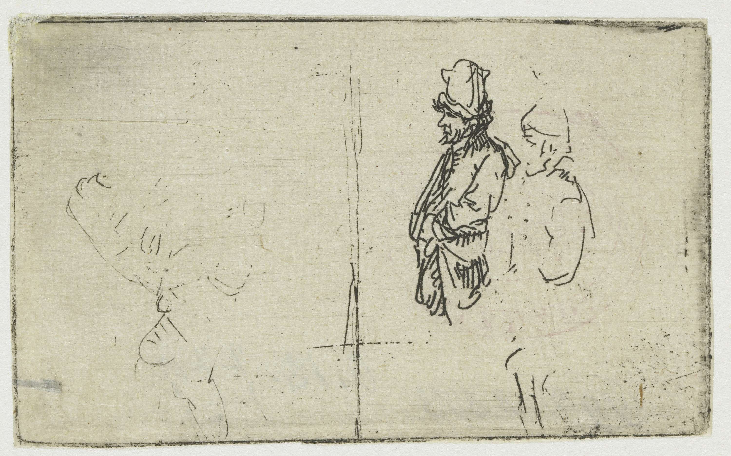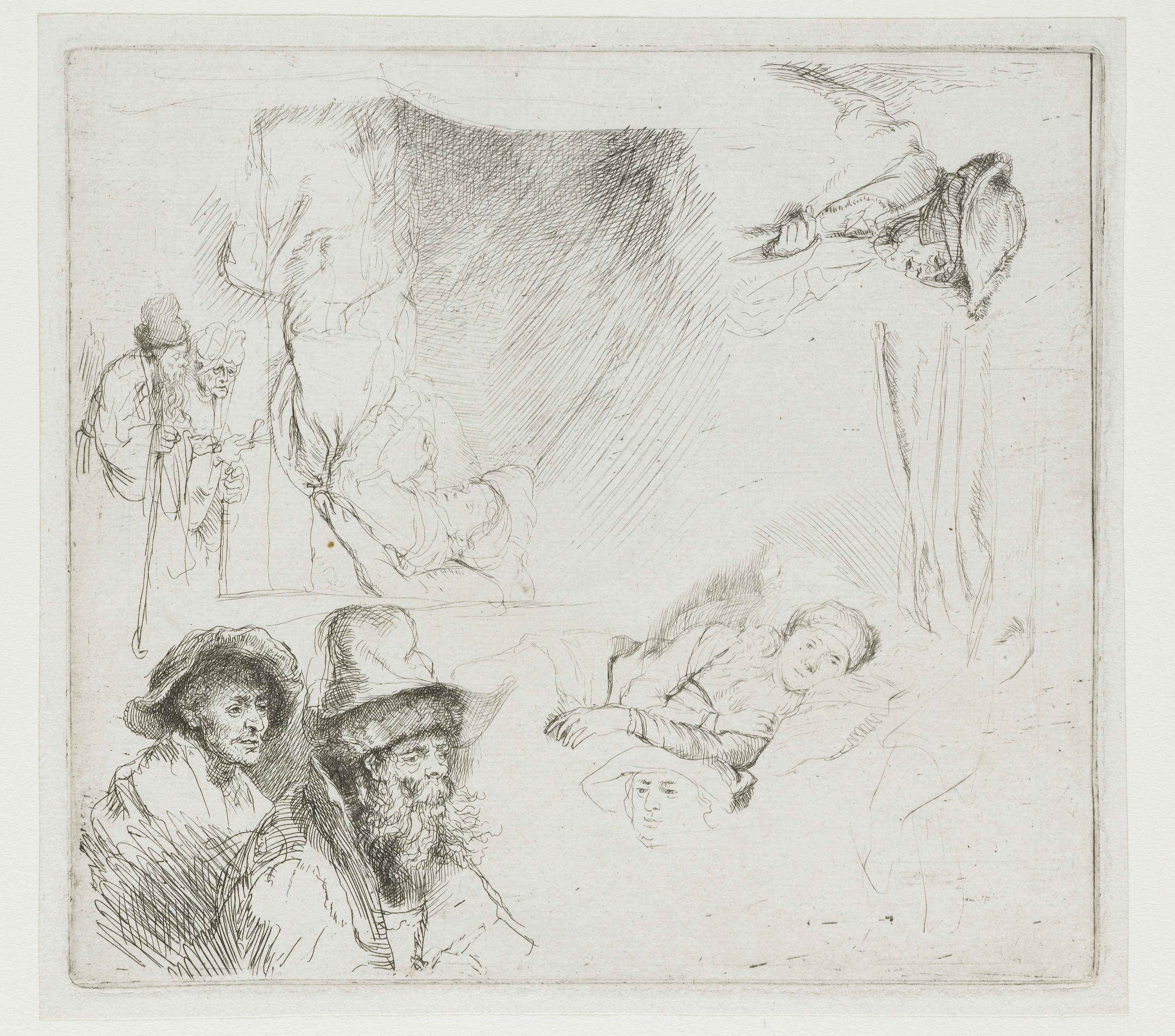 Studieblad met zelfportret, bedelaar, en vrouw met kind
