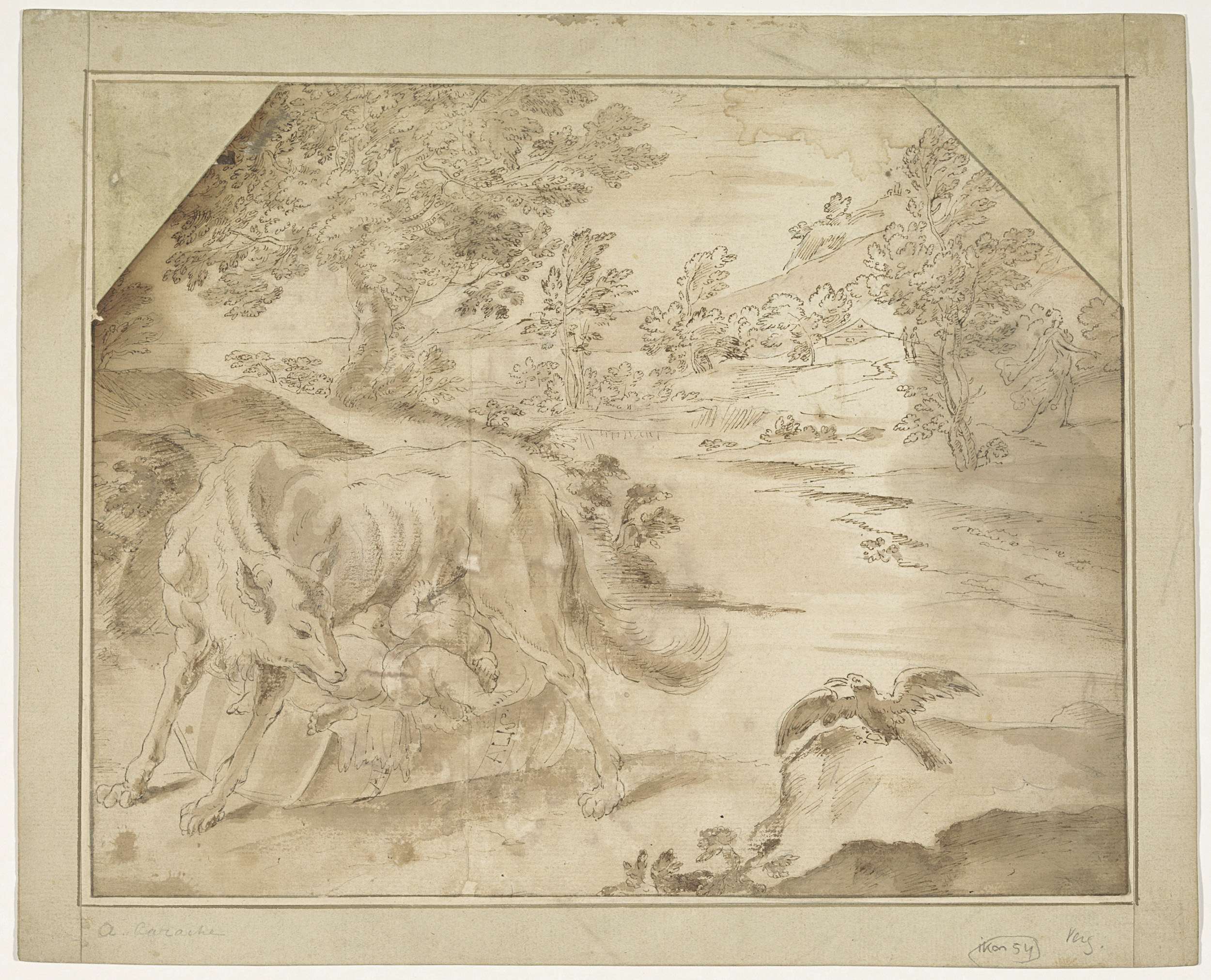 Landschap met Romulus en Remus gevoed door de wolvin