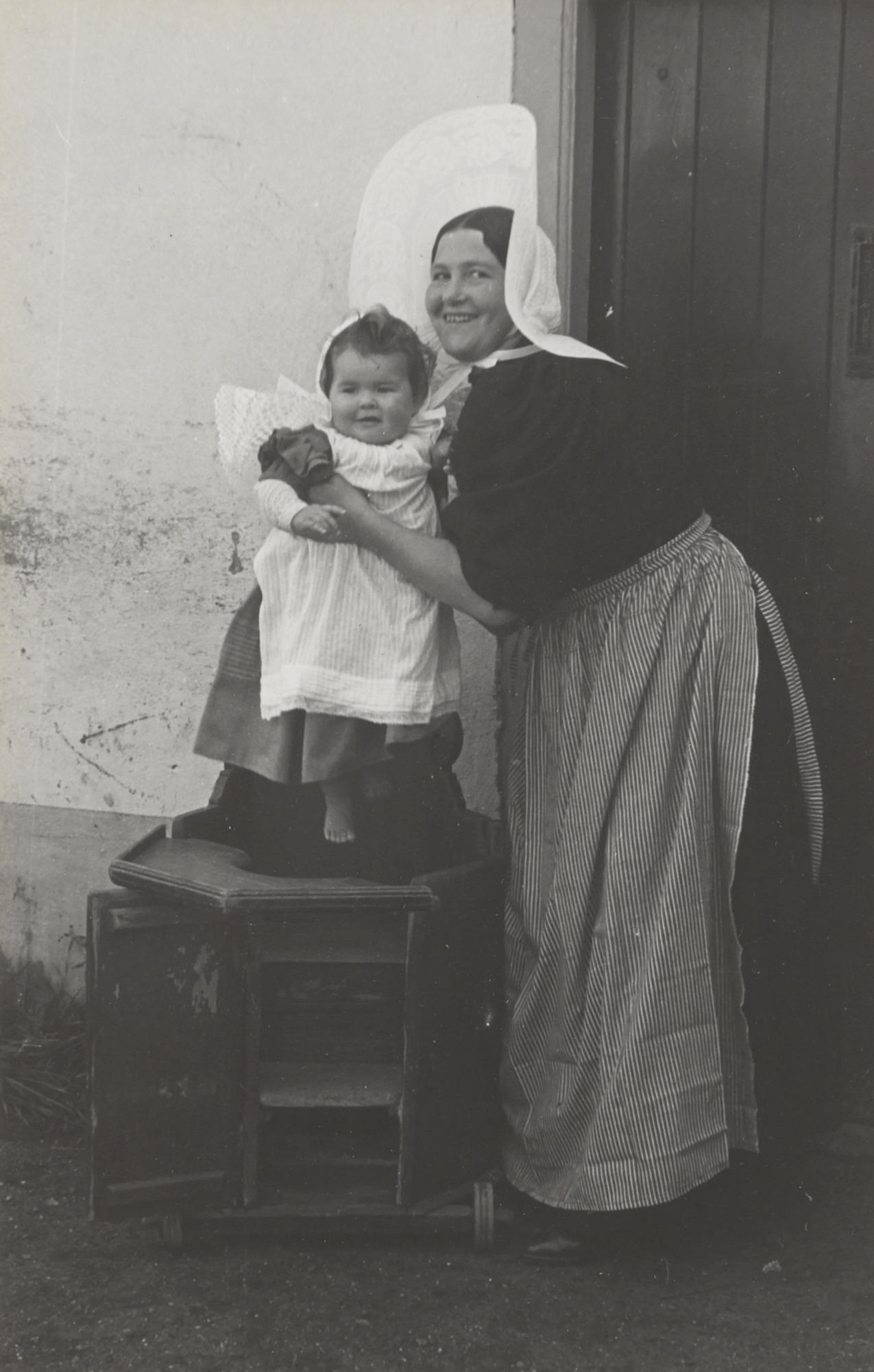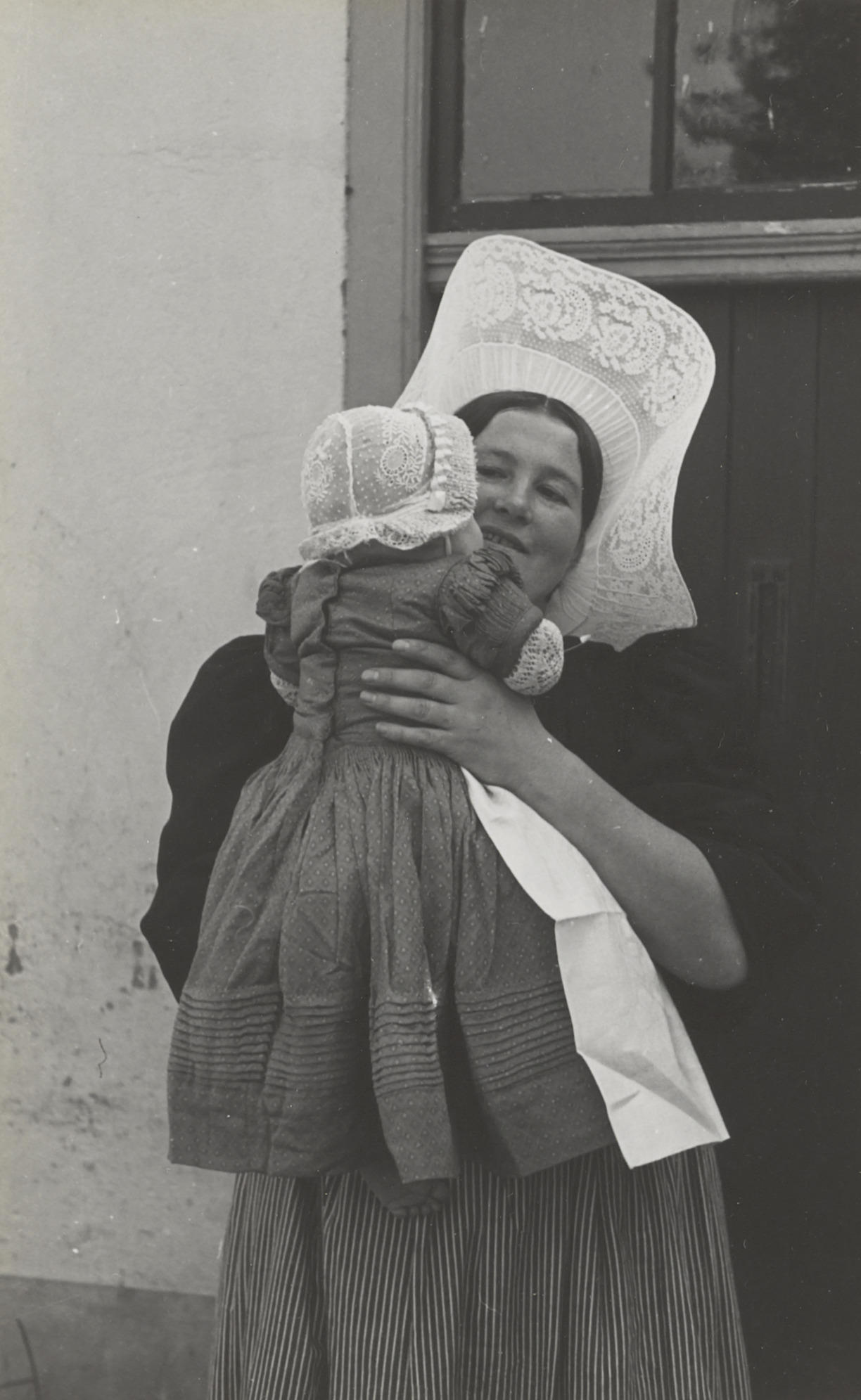 Vrouw en kind in streekdracht, Huizen, 1945 (zwart-w...