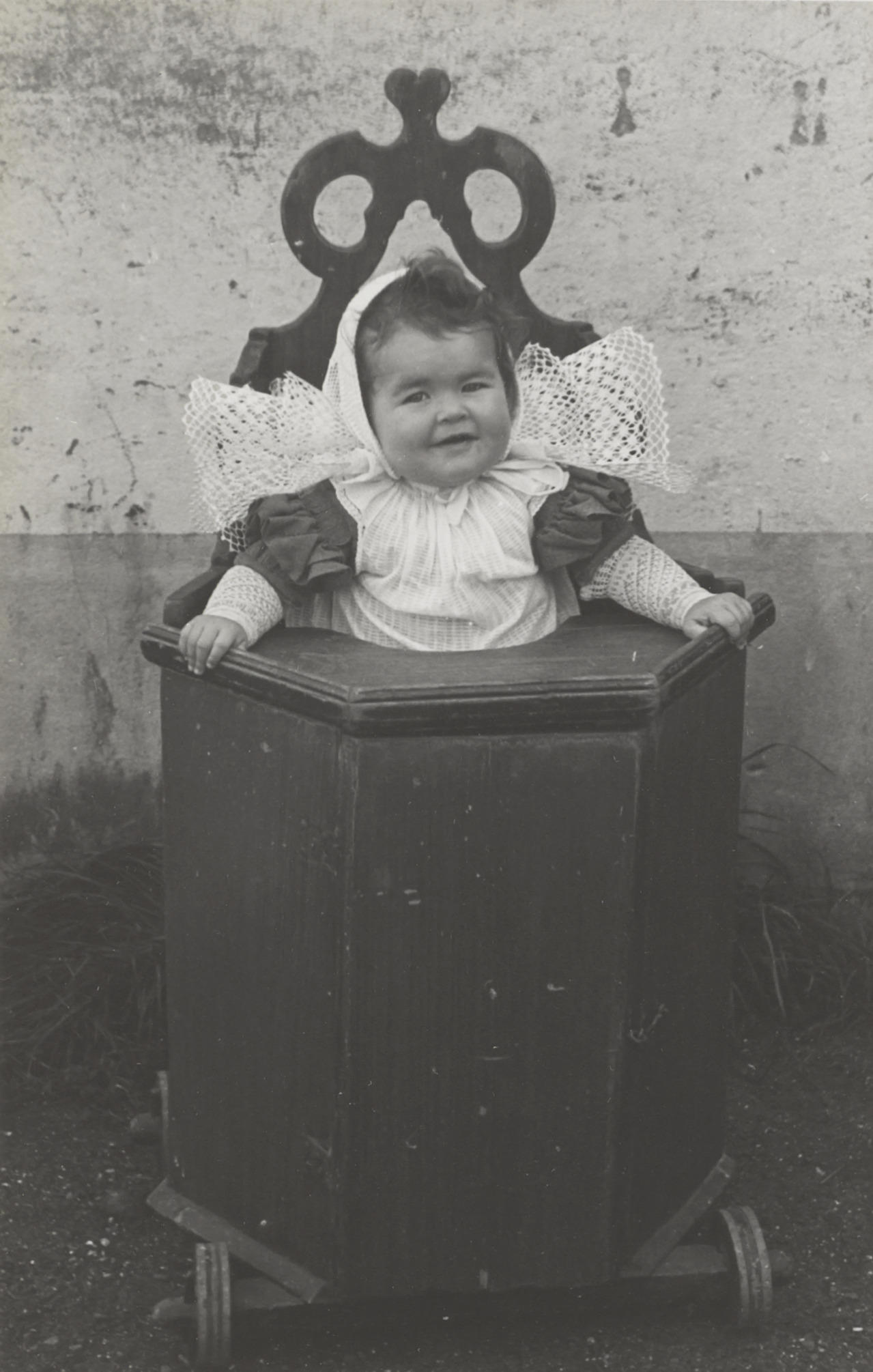 Ingebakerde baby in streekdracht, Huizen, 1945 (zwar...