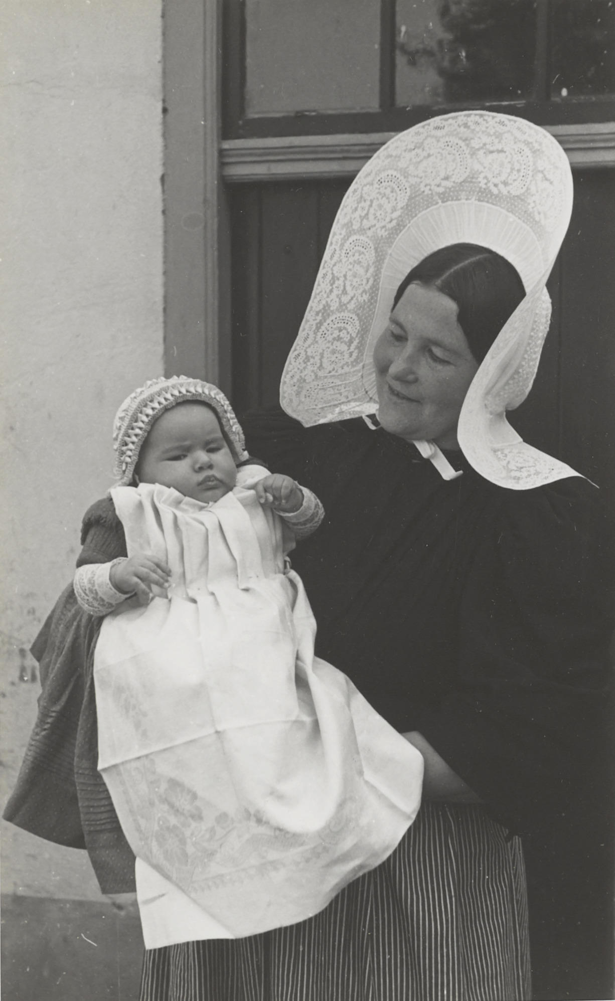 Vrouw en baby in streekdracht, Huizen, 1945 (zwart-w...