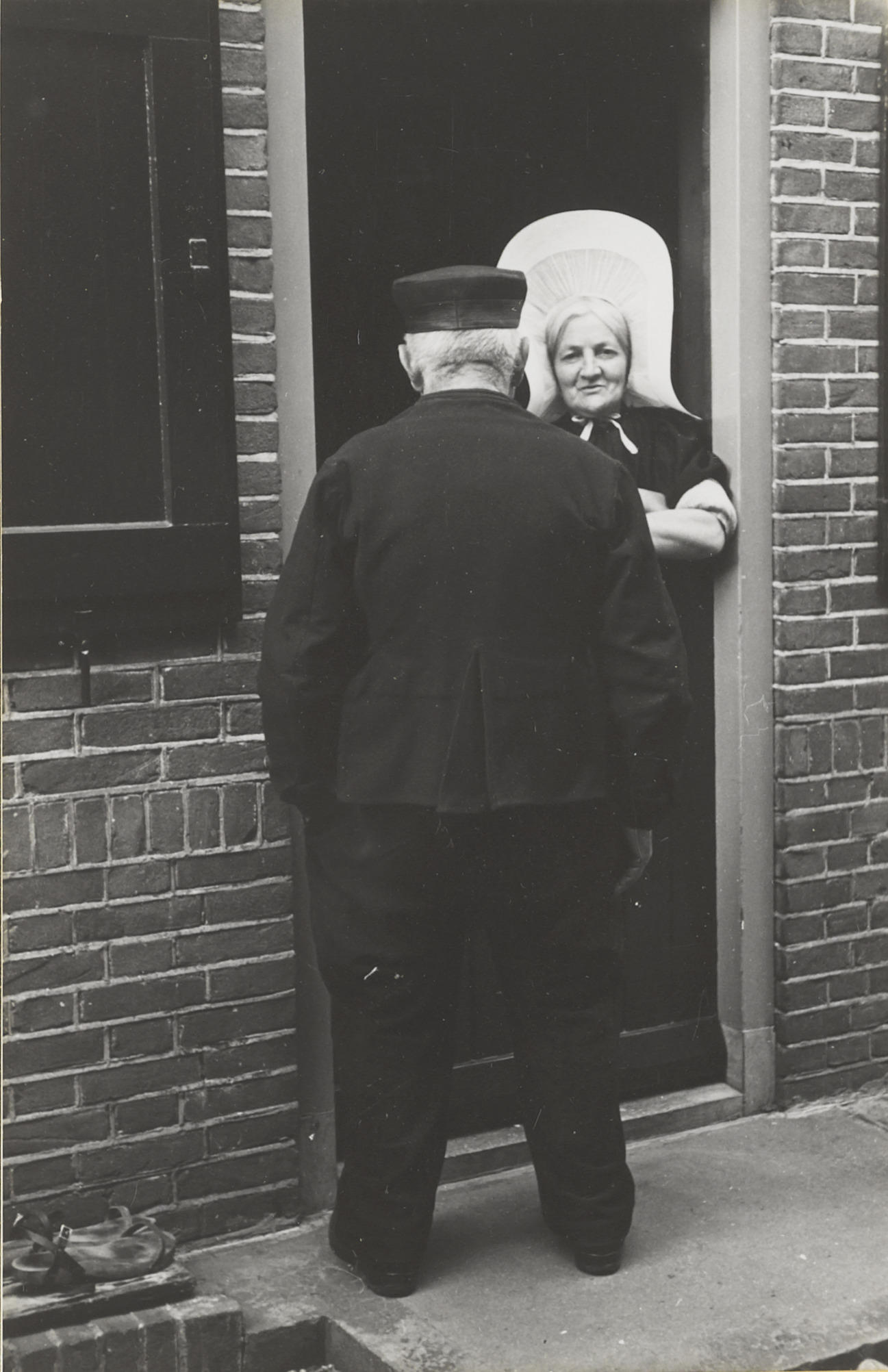 Man en vrouw verkleed in streekdracht, Huizen, 1945 ...