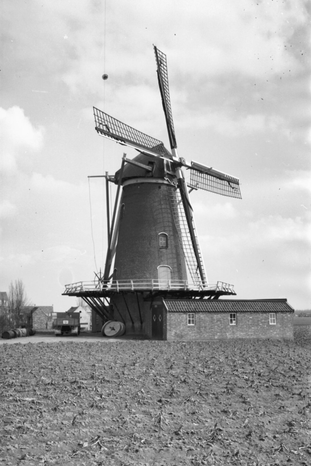 Ronde stenen stellingmolen van opzij gefotografeerd