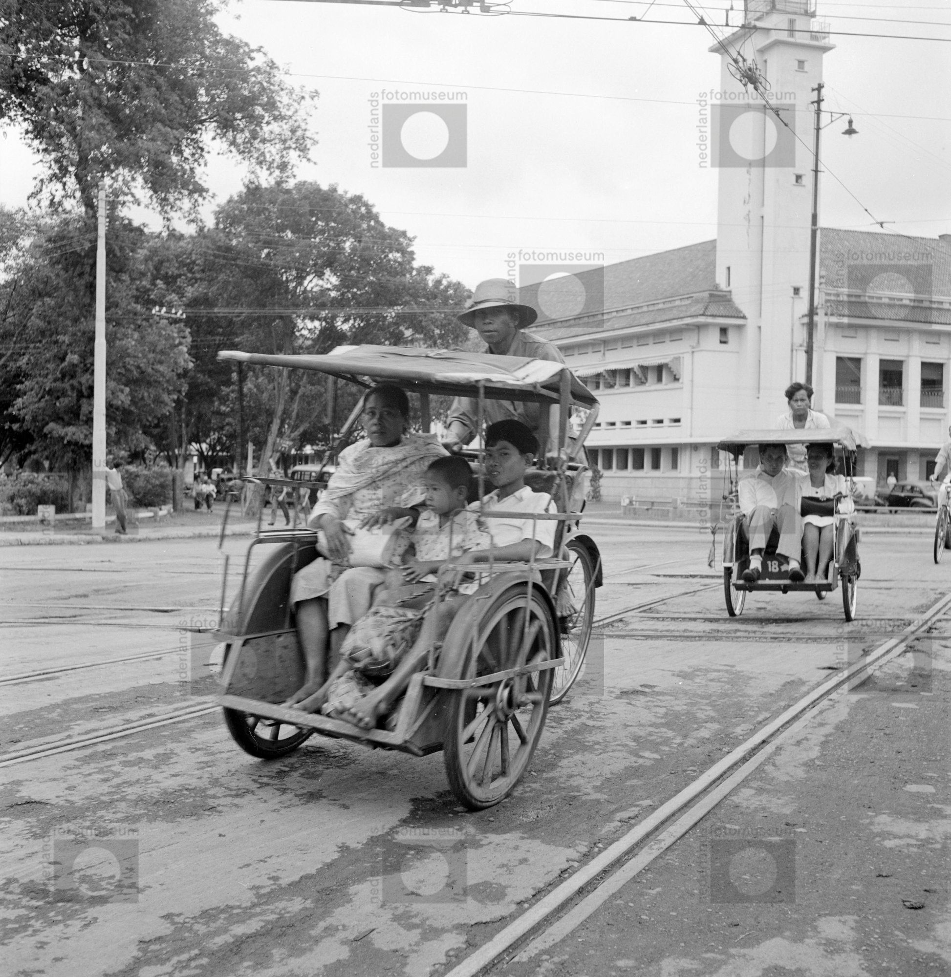 Een fietstaxi (riksja) rijdt over een kruispunt te J...