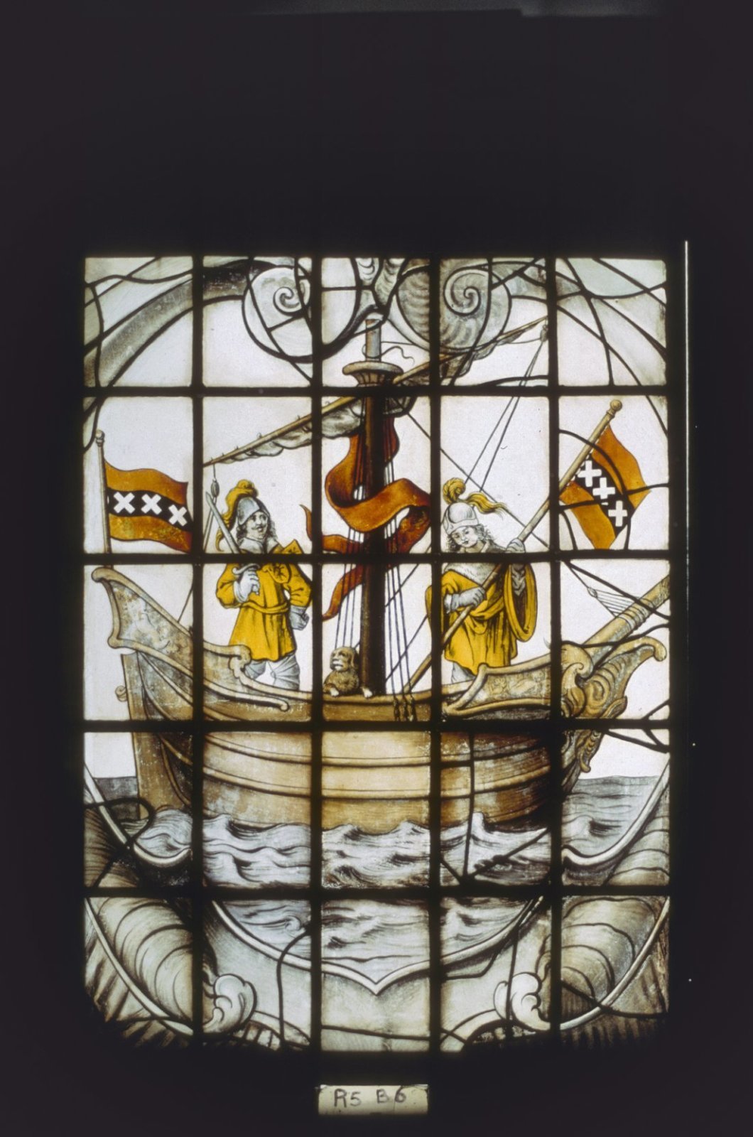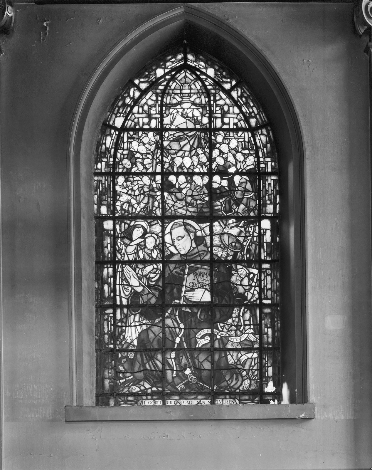 Interieur, gebrandschilderd glas, raam 17: "Makelaar...