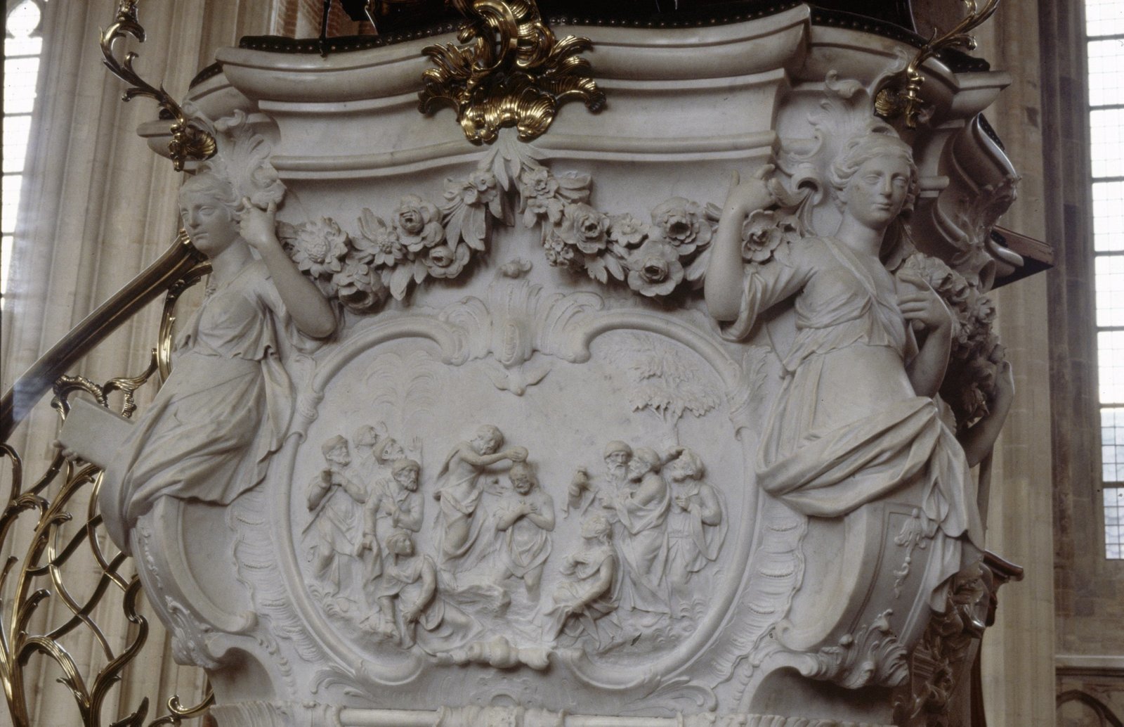 Interieur, marmeren kuip van de preekstoel met bijbe...