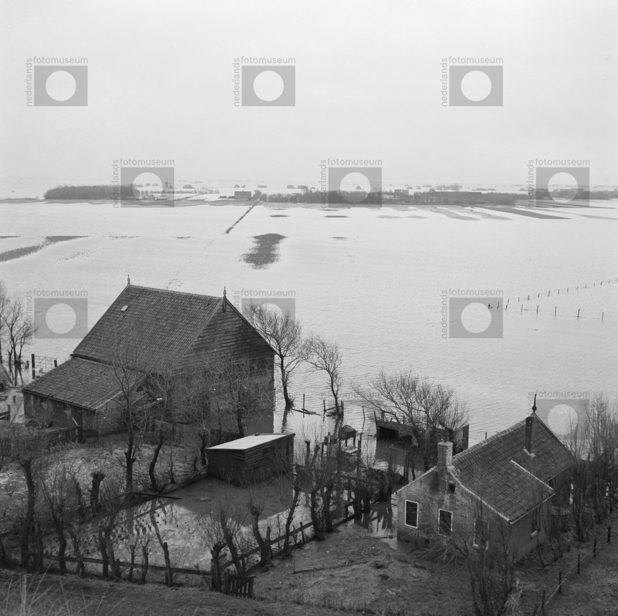 Boerderijen in overstroomd landschap na de Watersnoo...