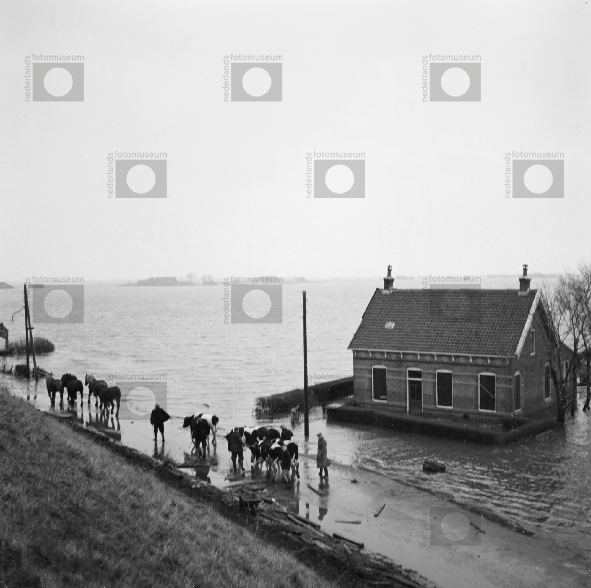 Vee in ondergelopen landschap na de Watersnoodramp, ...