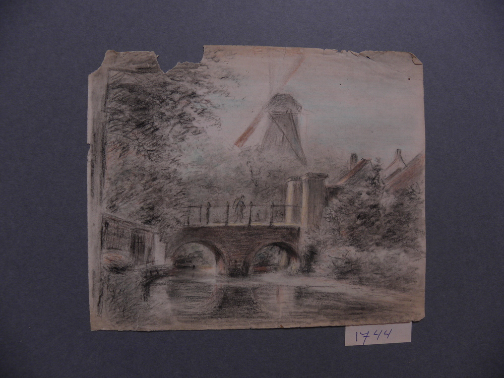 Potloodtekening op papier voorstellende gracht, brug...