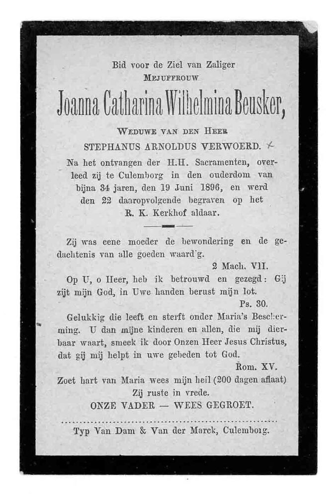 bidprent voor Joanna Catharina Beusker. Geboren 1862...