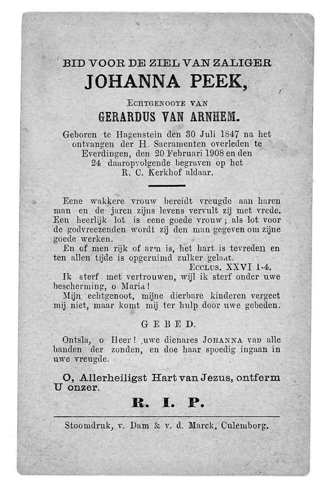 bidprent voor Johanna Peek. Geboren 30-07-1847 te Ha...