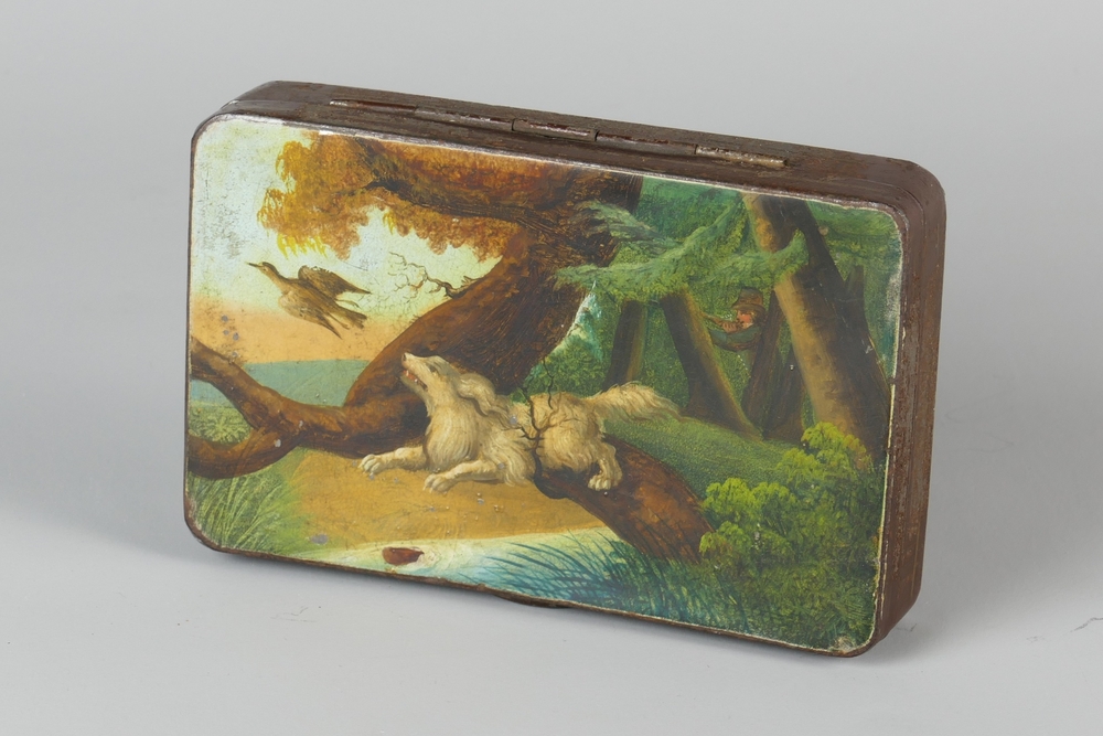 blikken tabaksdoos, met afbeelding van een jachthond...