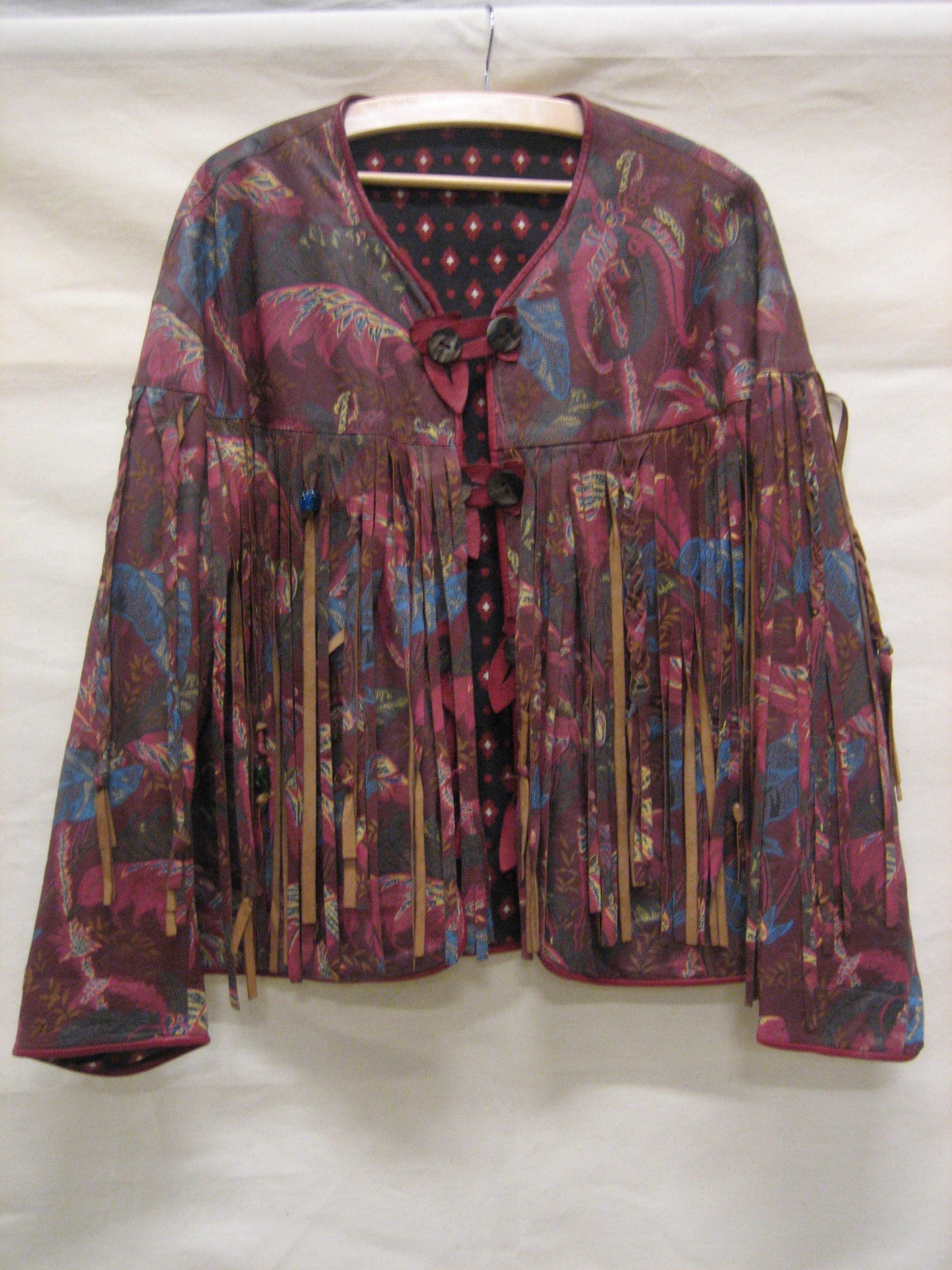 Jasje van leer, roodbruin bedrukt met tropische plan...