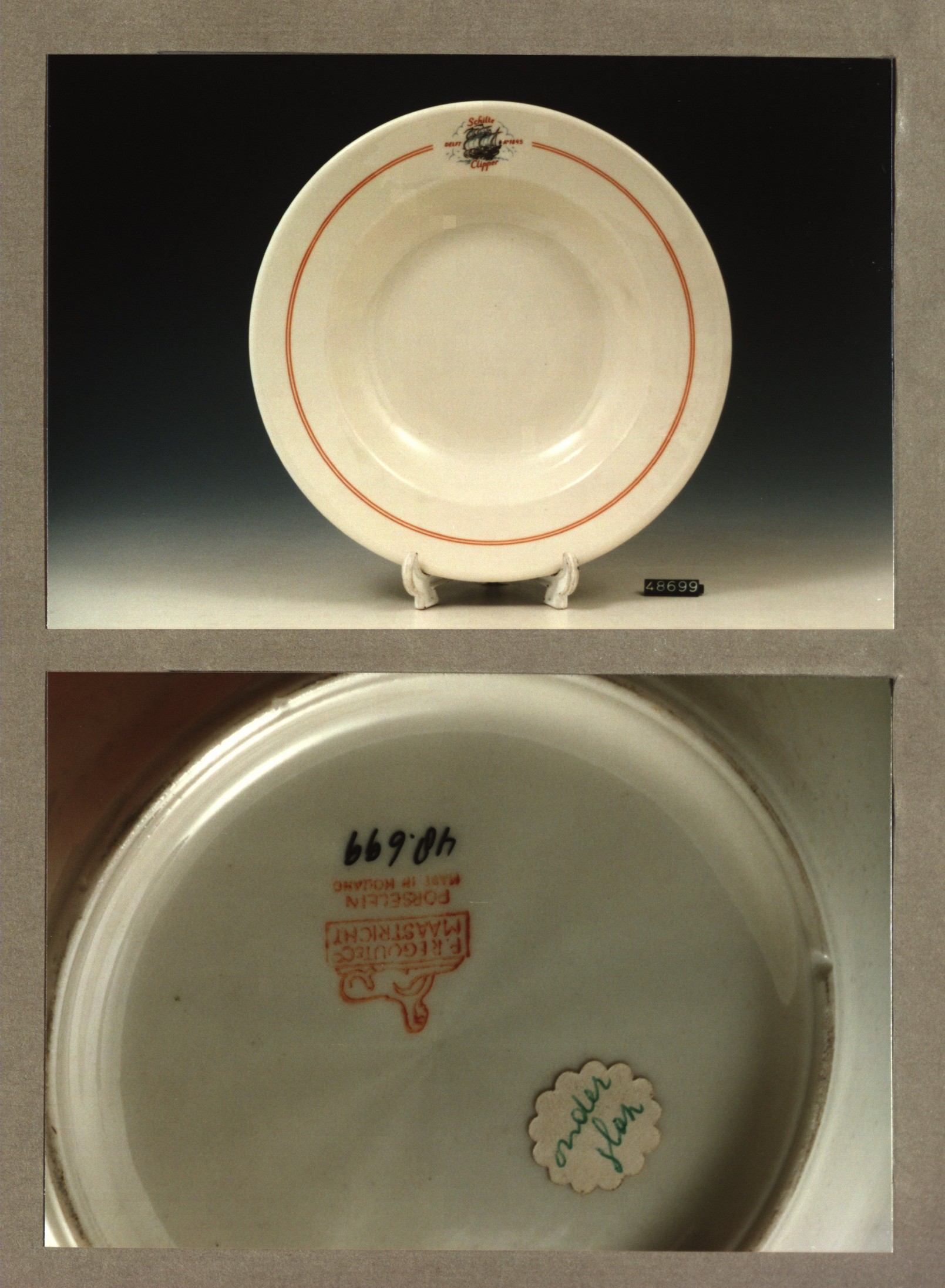 Diep bord, model P met decor Schilte clipper Delft 1845