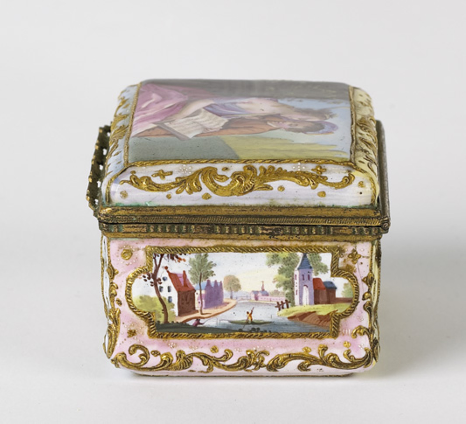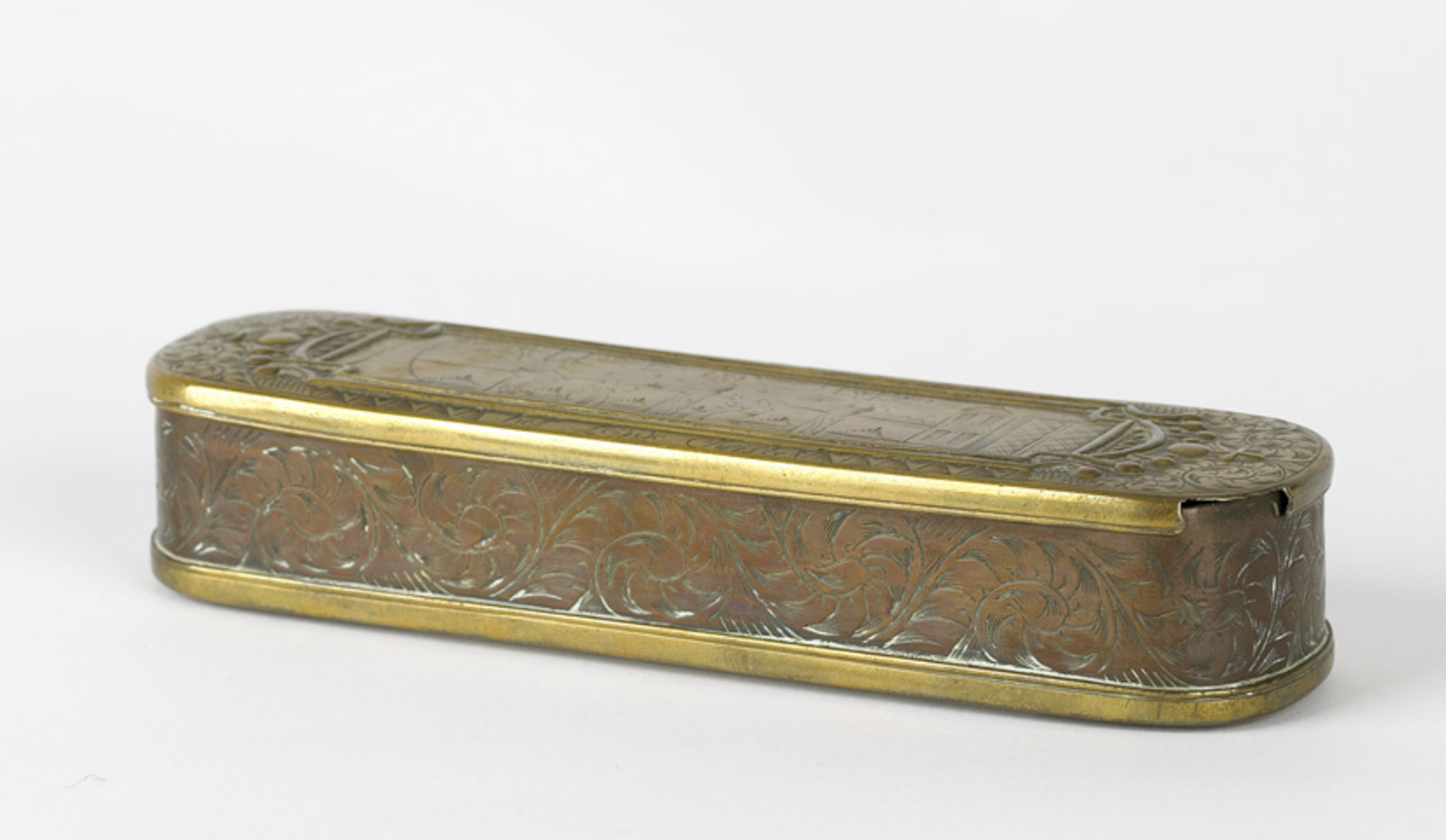 Tabaksdoos van koper en messing met een voorstelling...