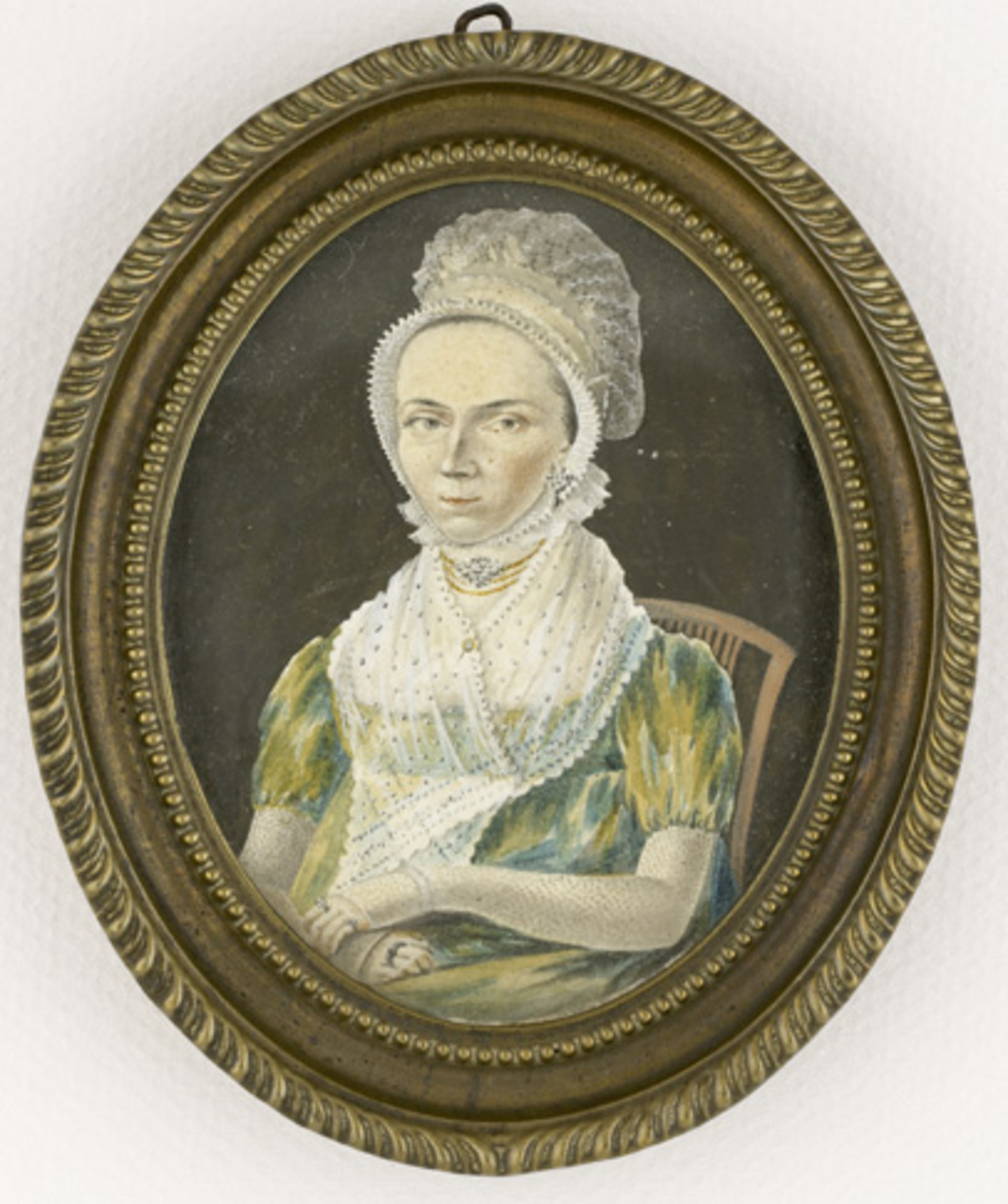 Portret van een vrouw met muts in groen-gele japon