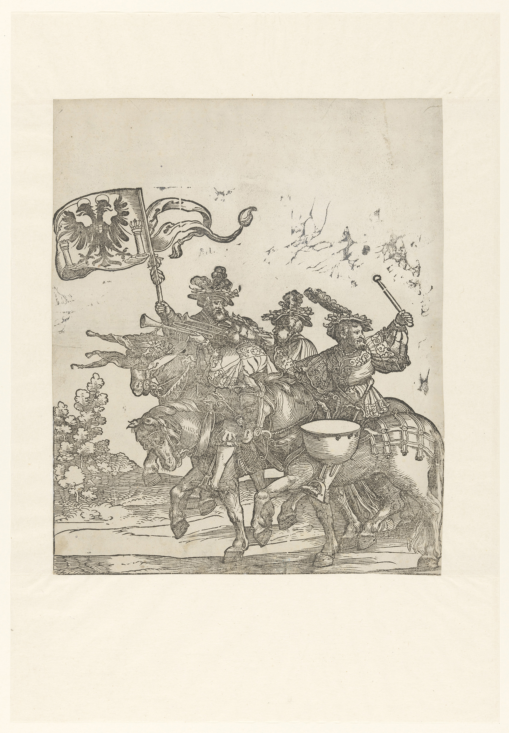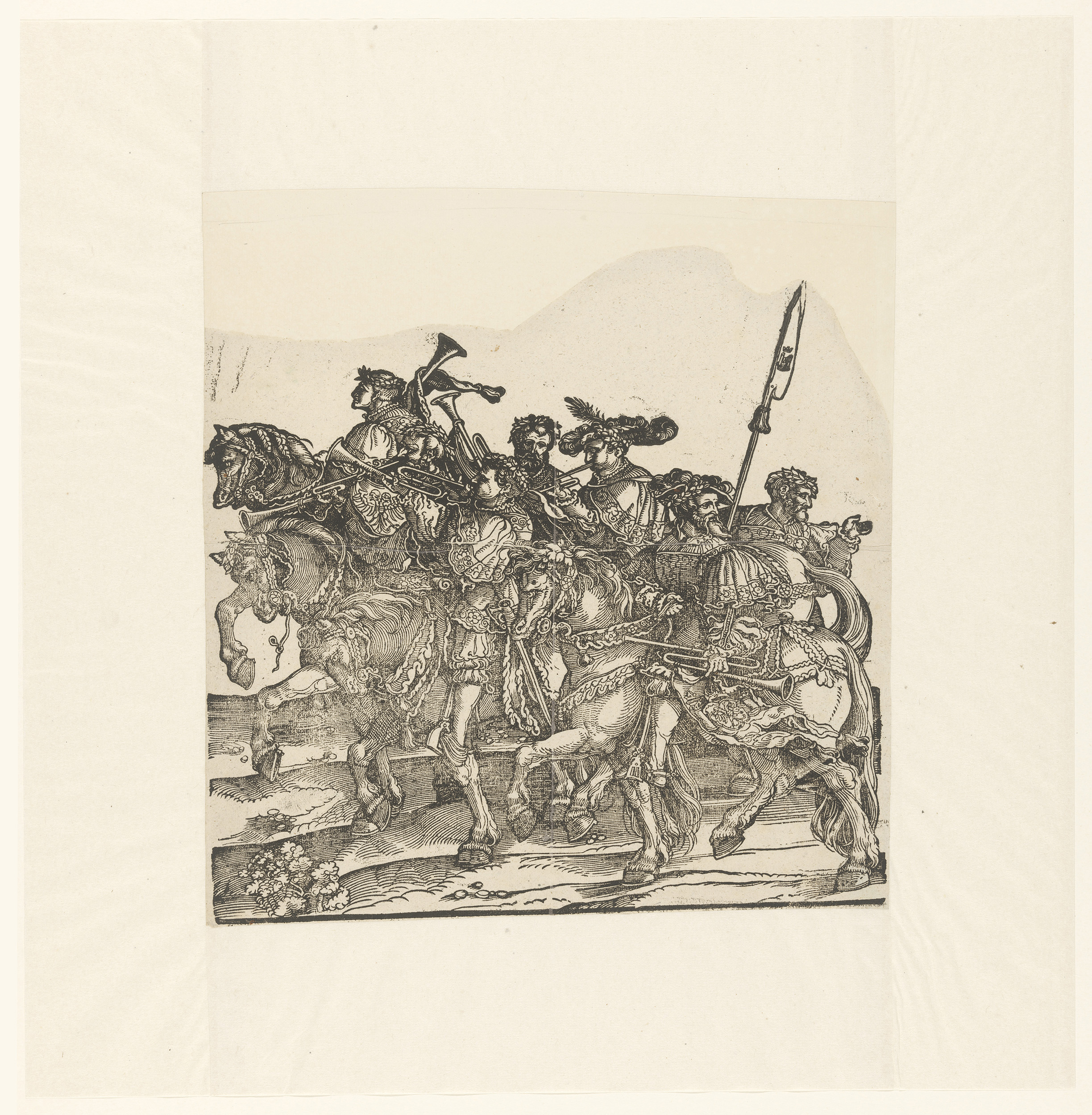 Vaandeldrager, twee trompetters en een trommelslager