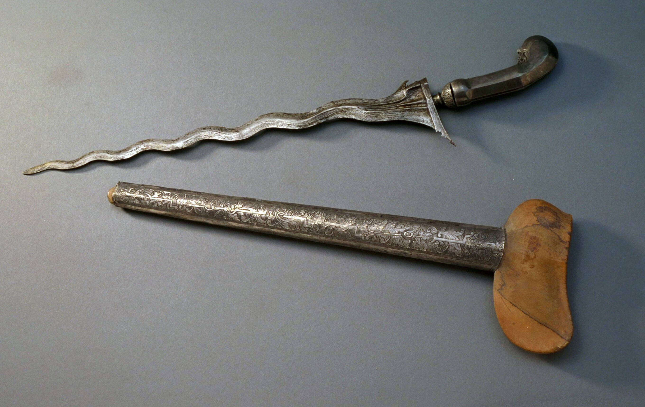Zilveren kris met houten schede en zilveren overschede