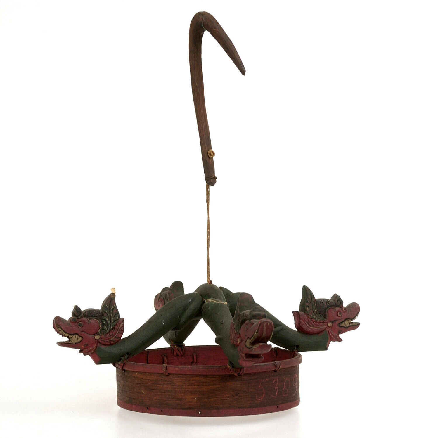 Houten ophanghaak met vier drakenkopppen
