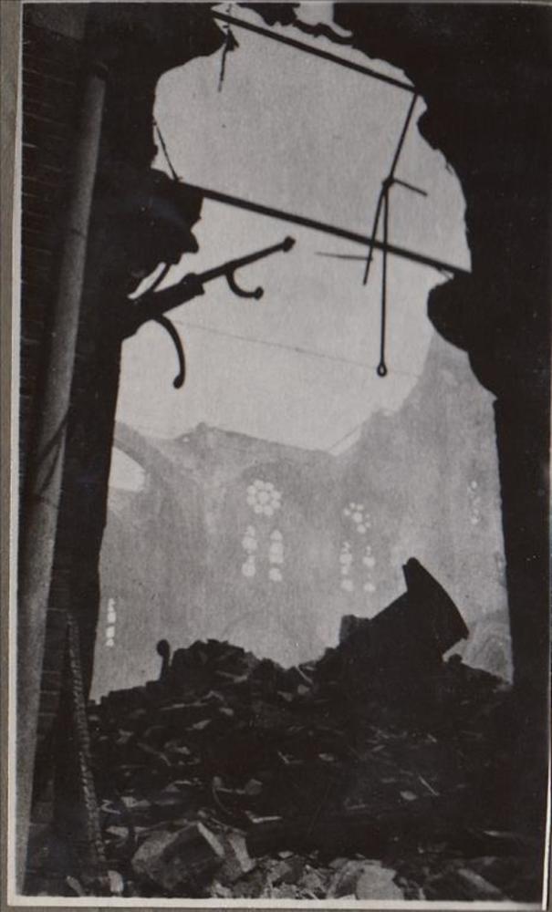 Foto van het interieur van de verwoeste Sint Laurens...