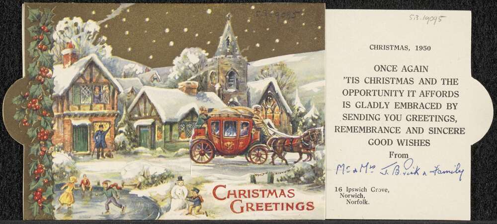 Kerstkaart van Mr. & mrs. J.B. Pick, gedateerd 1950