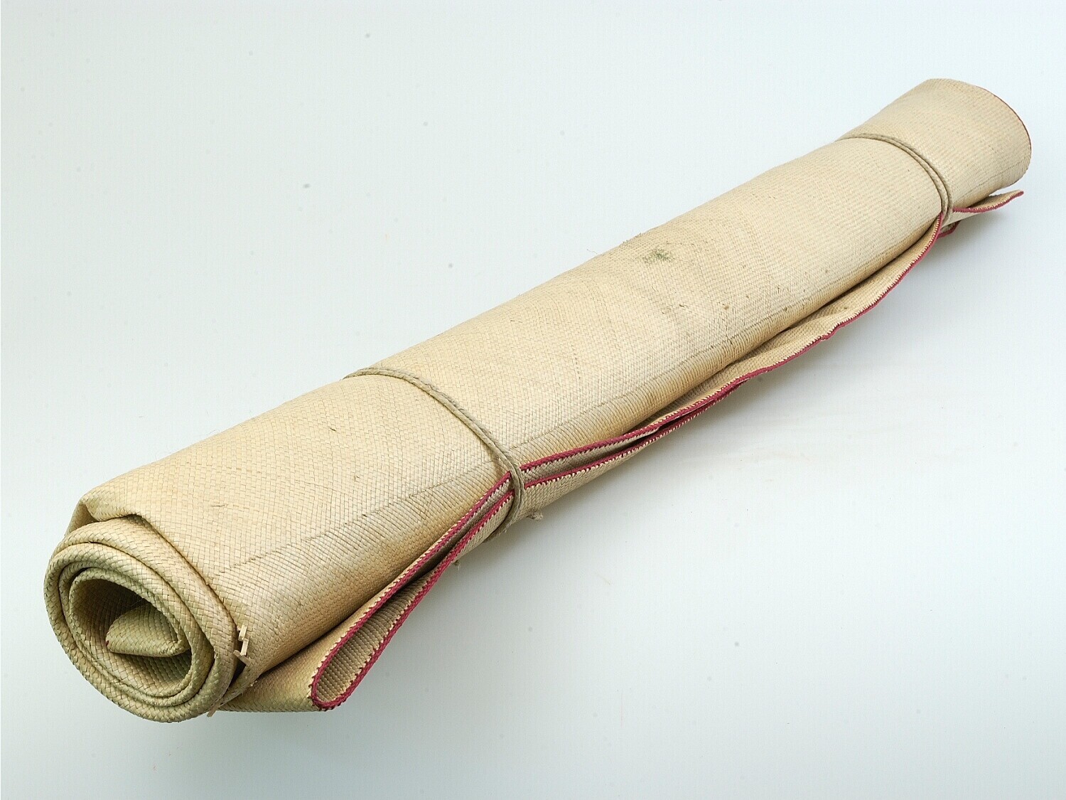 Mat van gevlochten biezen, met groen garen omboord