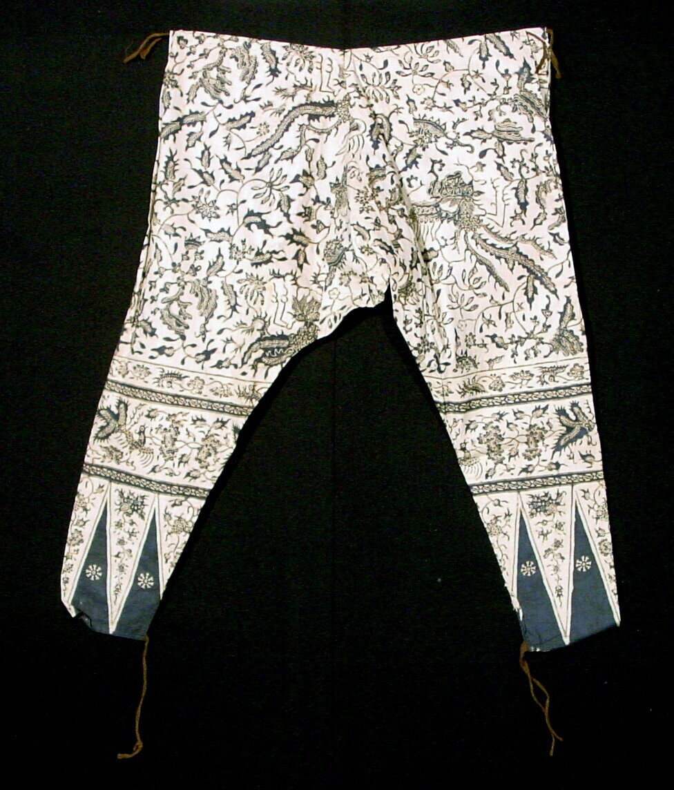 Gebatikt jongensbroek, met plantenmotieven versierd