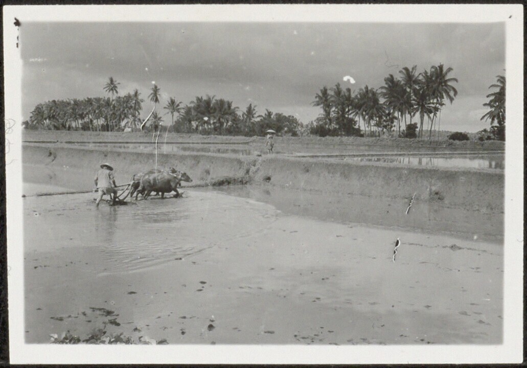 Arbeider verricht met behulp van runderen werkzaamhe...