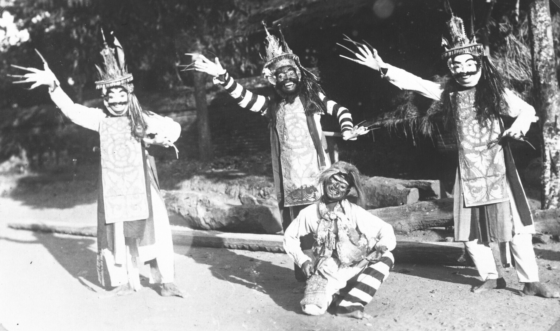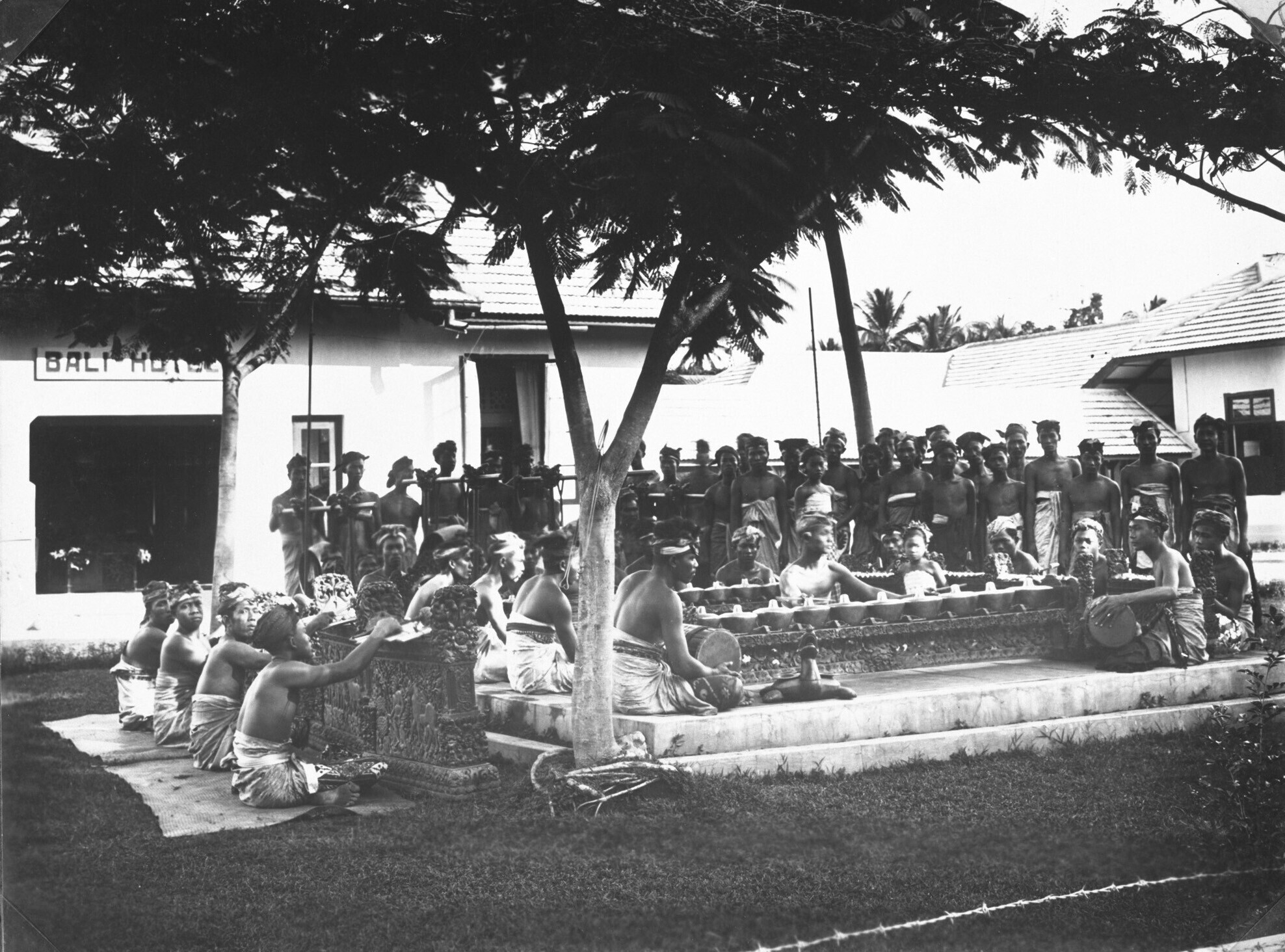 Groepsportret van janger danseressen en dansers op Bali