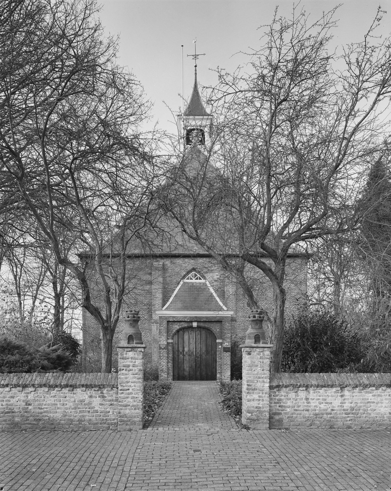 Voorgevel met portaal en kerkhofhek met miniatuur-bu...